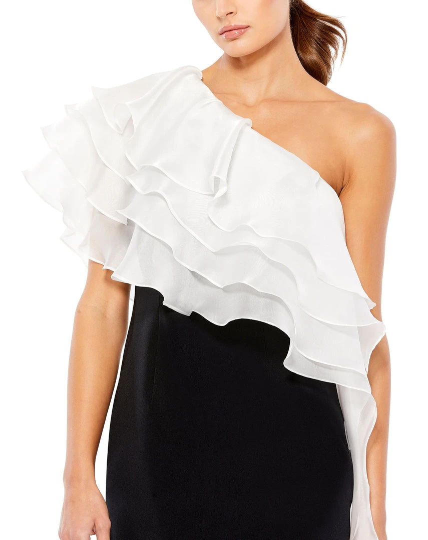 Two-tone one-shoulder chiffon cocktail dress with a fitted skirt and a dramatic diagonal ruffled bodice.