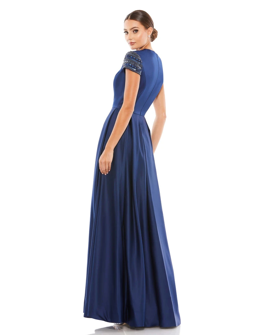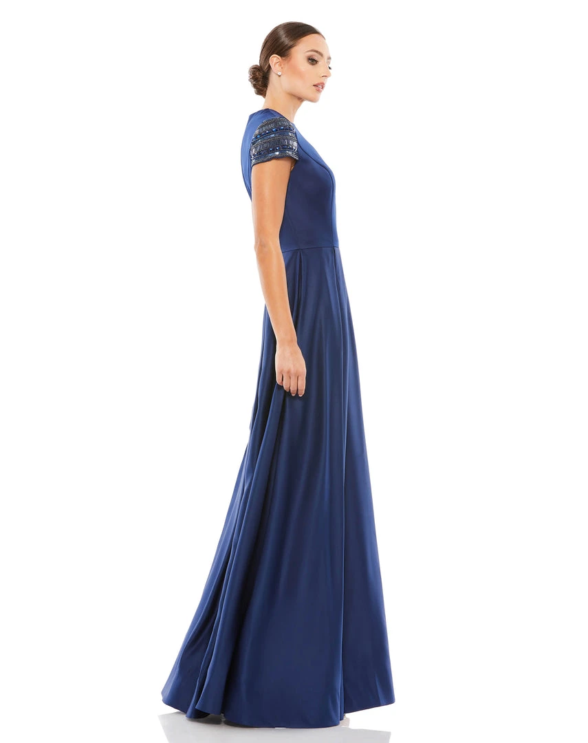 Elegantly tailored a-line evening gown with a high round neckline and hand-beaded cap sleeves
