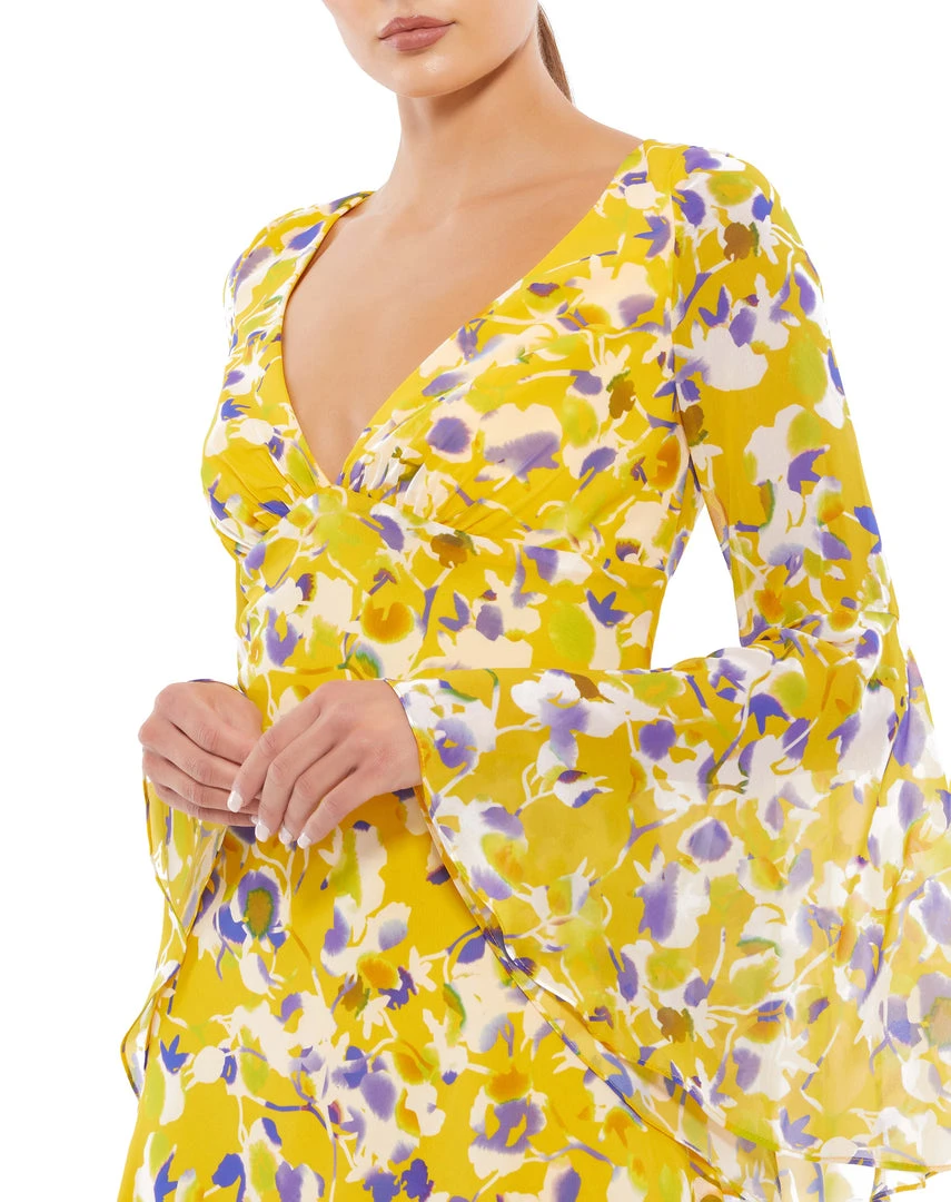 Yellow v-neck floral chiffon mini dress with flowing bell sleeves.