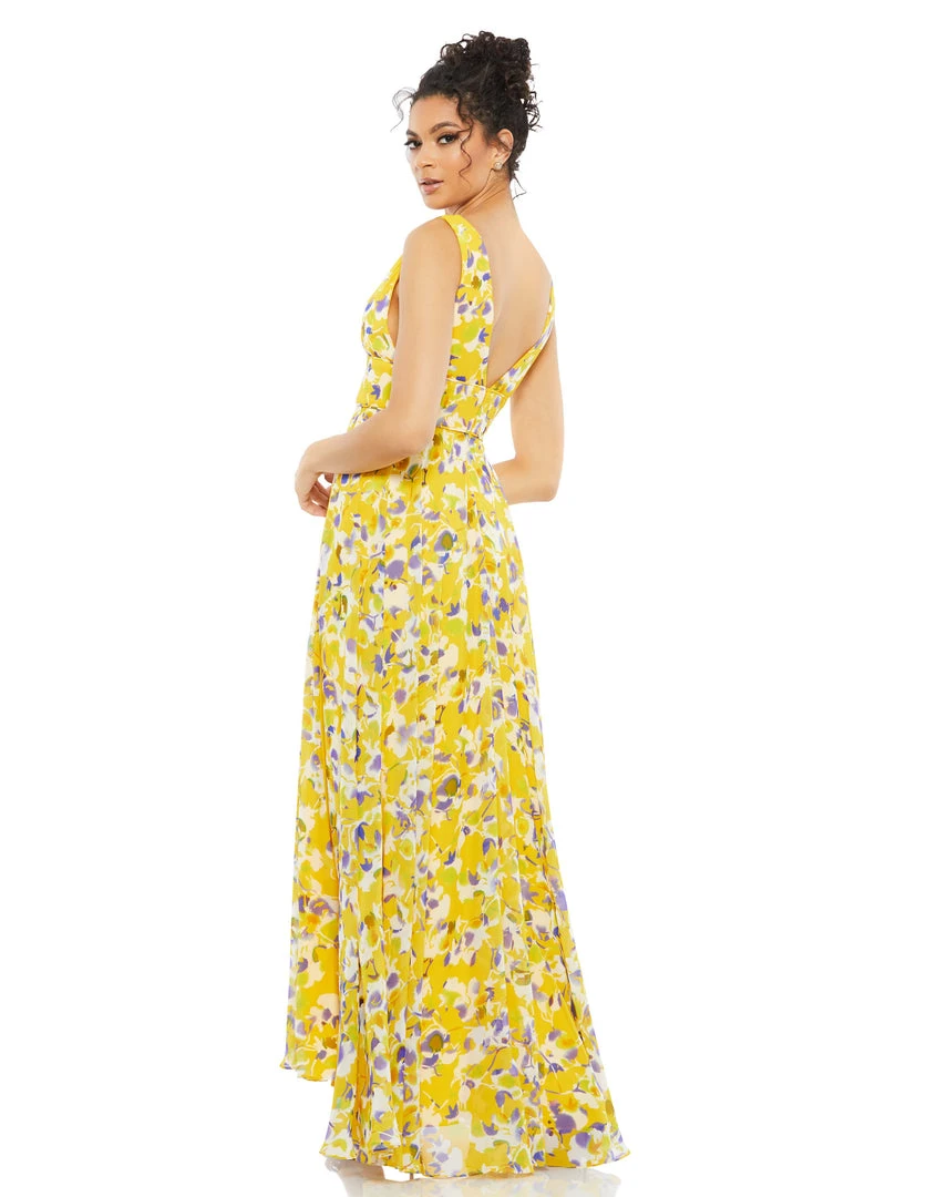 Flowy yellow floral maxi dress with a deep-v neckline, banded waist, and pleated floor-length skirt with a thigh-high slit