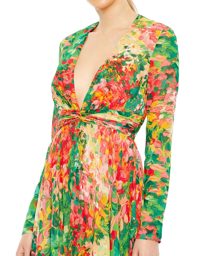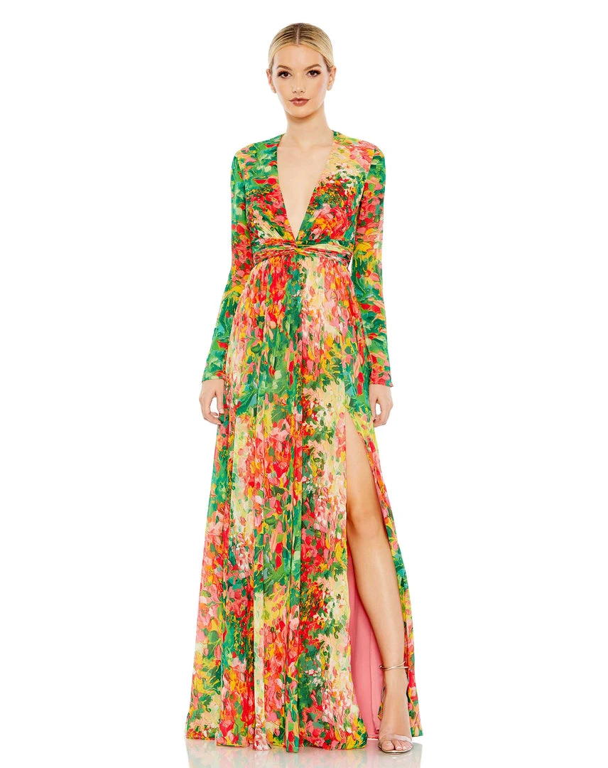 Ieena For Mac Duggal Floral Print Front Twist V Neck Long Sleeve Gown