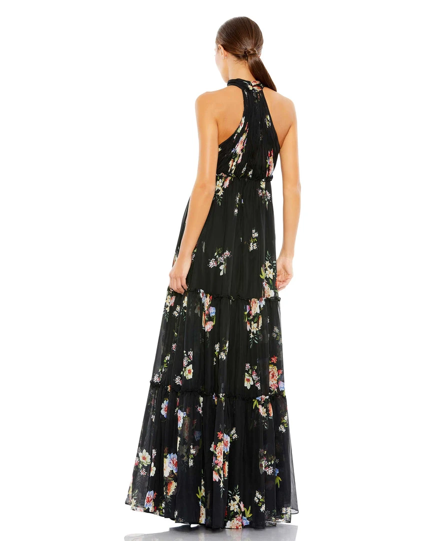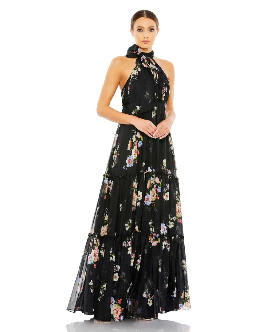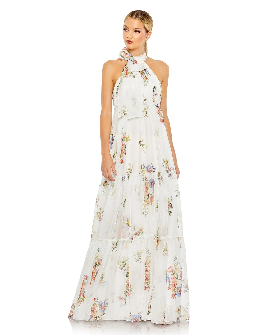 Ieena For Mac Duggal Floral Print Ruched Tiered High Neck Bow Gown Shop For