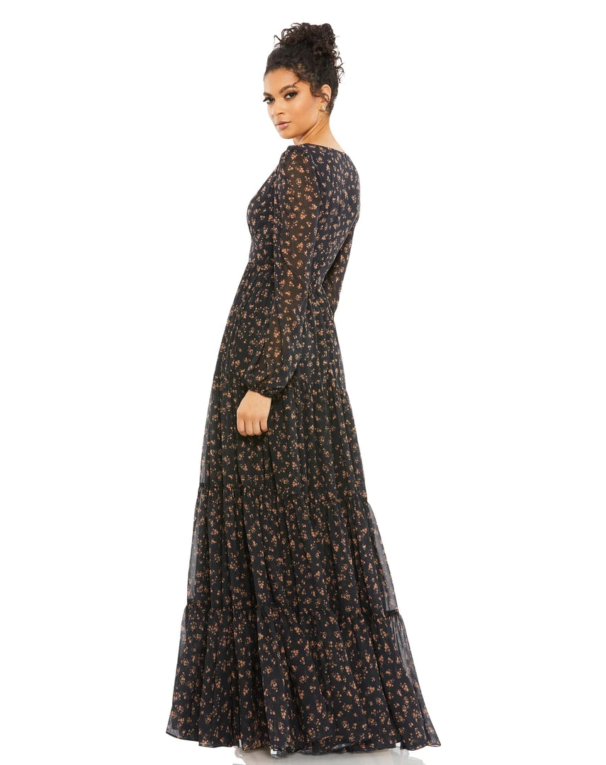This sweeping maxi is a glamorous take on bohemian dressing. Fashioned from floral-print chiffon the dress is designed with a V-neckline, long bishop sleeves, a built-in waistband with faux button detail, and a billowing tiered skirt. Wear yours to a formal daytime wedding.