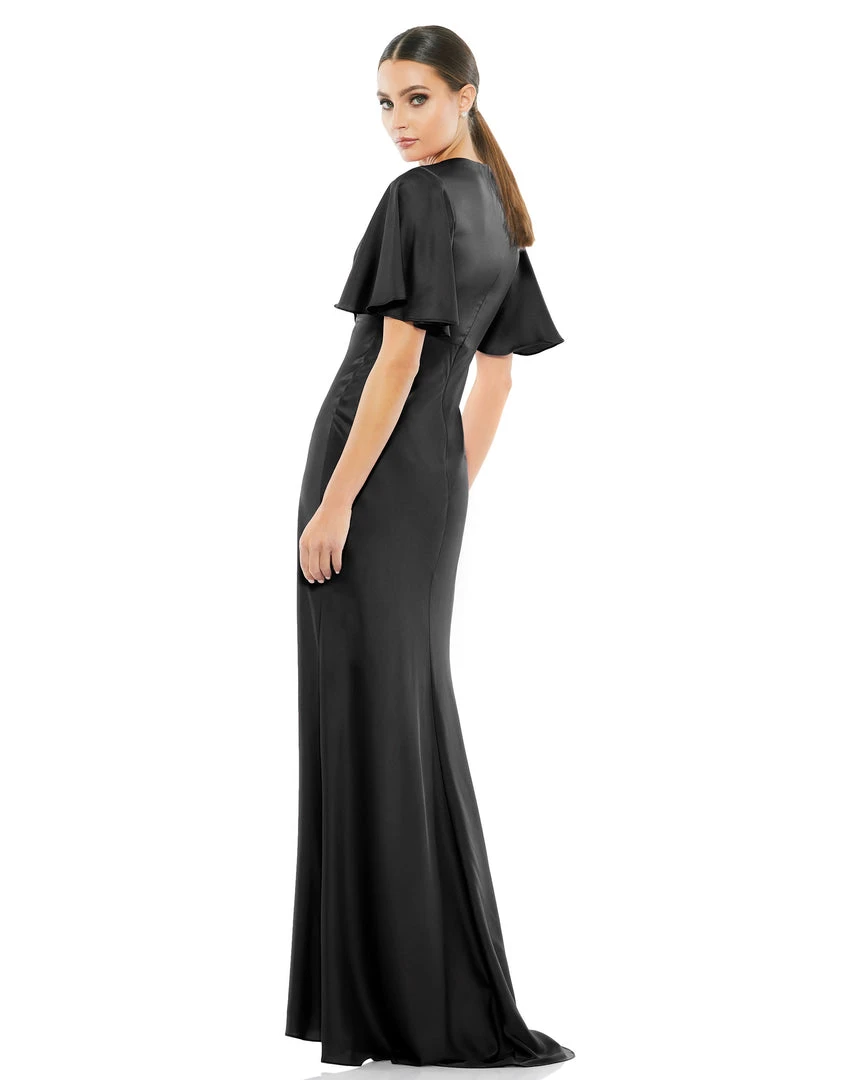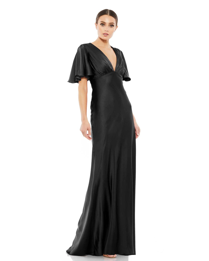Empire waist satin gown with flounce sleeves and a plunging v-neckline.