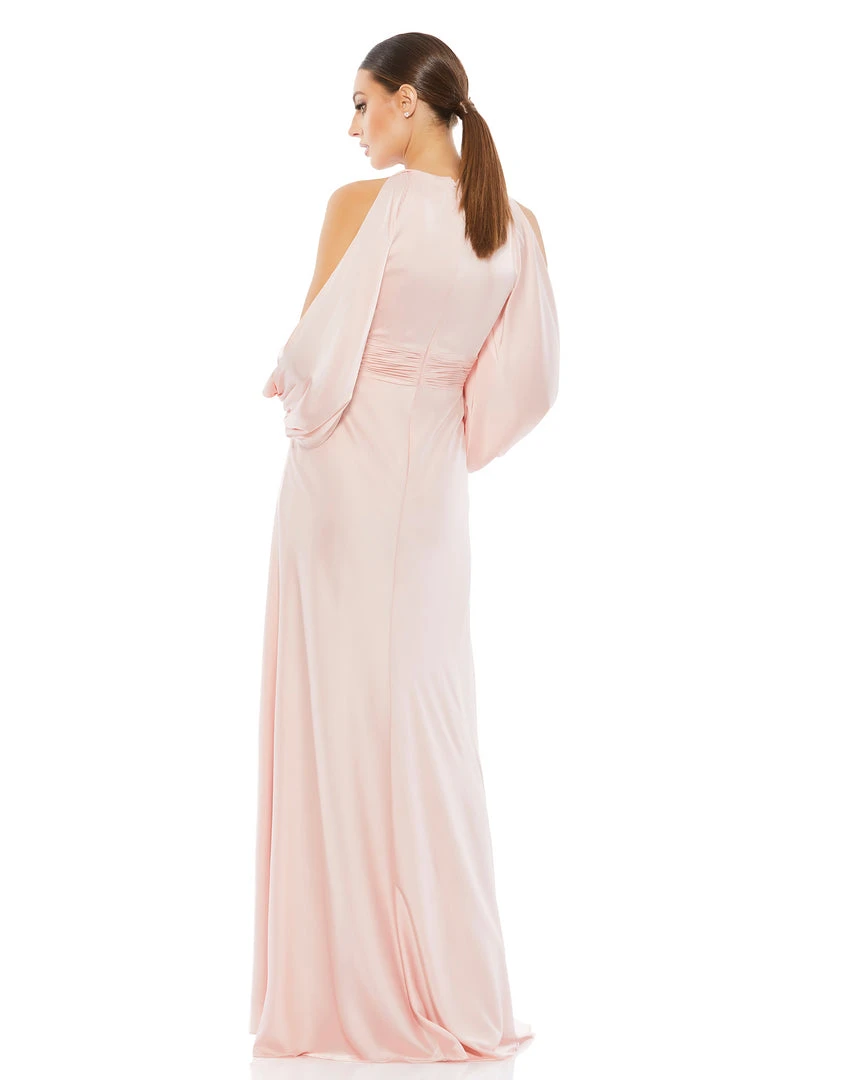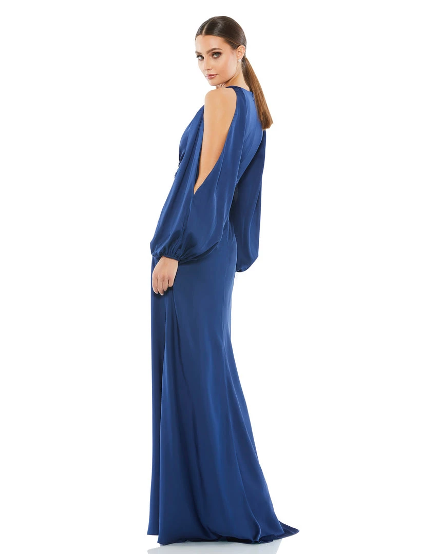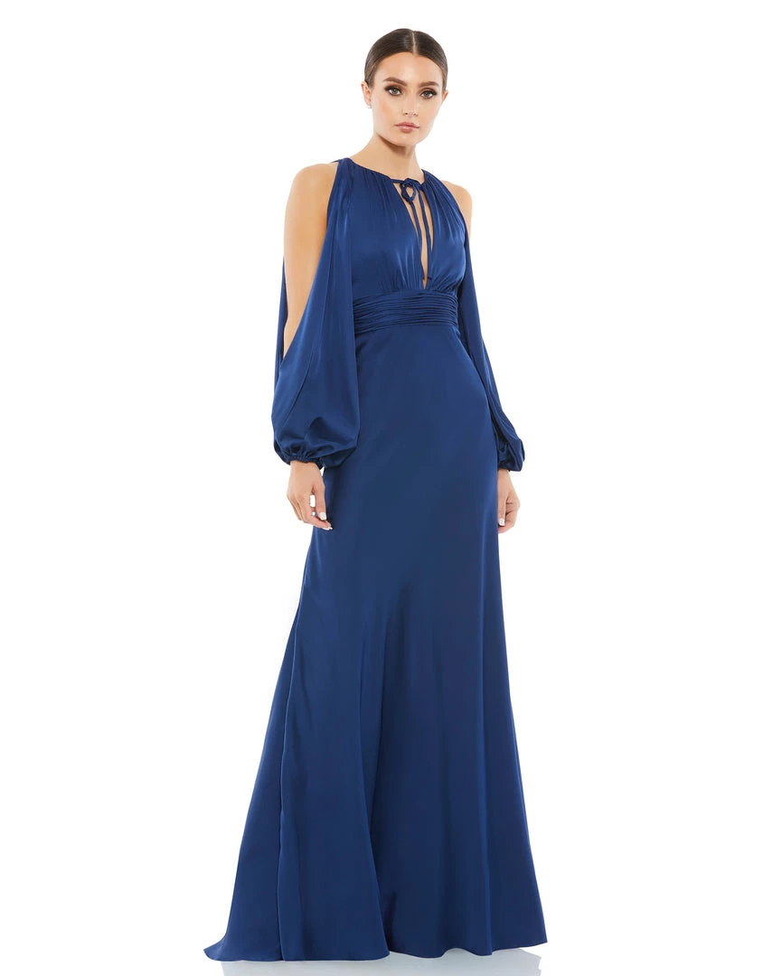 Flowing gown with a plunging self-tie keyhole neckline, pleated waistband, and cold-shoulder blousan sleeves.
