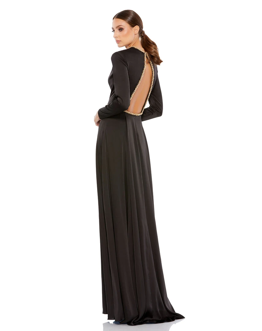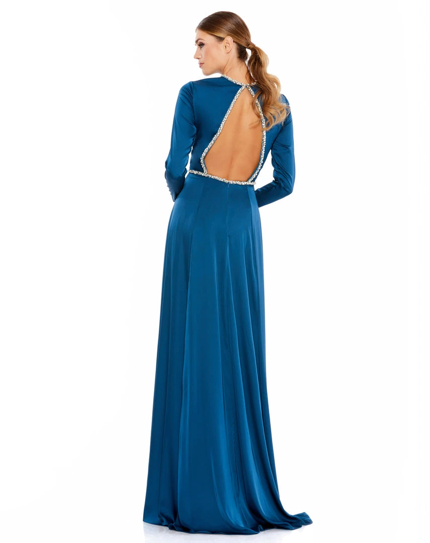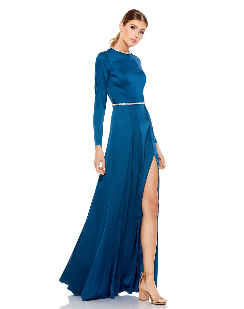Long-sleeved charmeuse gown accented with a bejeweled belt, neckline, jewel-trimmed open back.