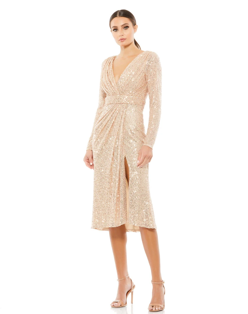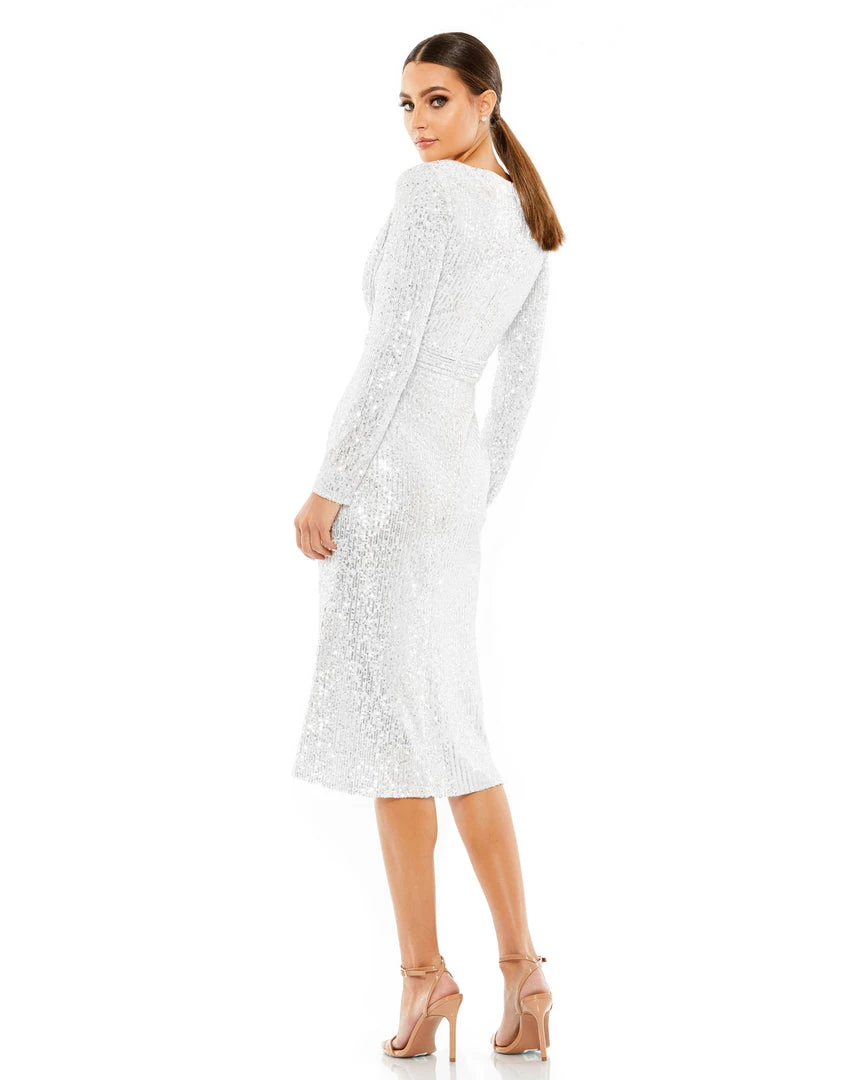 Long sleeve sequined midi dress with a faux wrap bodice, v-neckline, and draped midi-length skirt with a front slit.