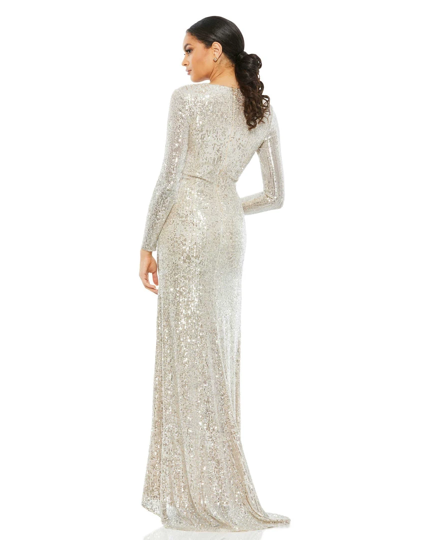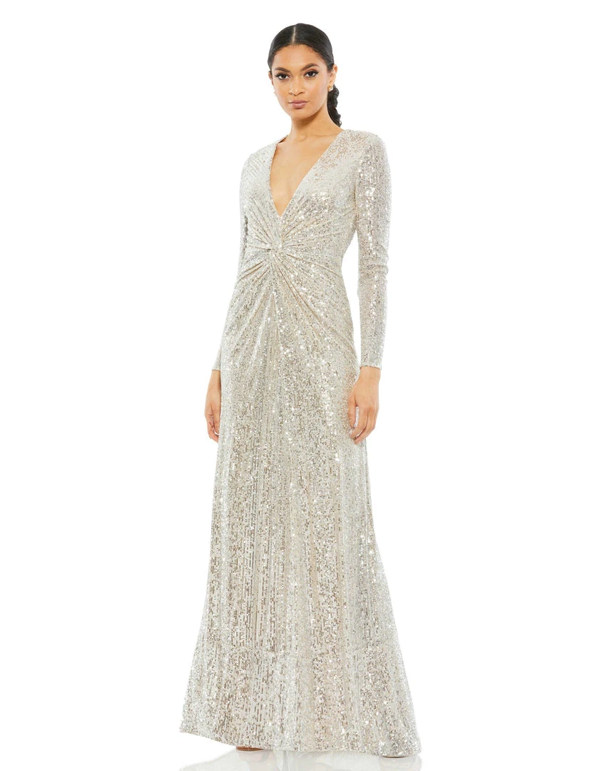 Stunning fully-sequined gown with a plunging v-neckline, semi-sheer illusion sleeves, and a gathered waist.