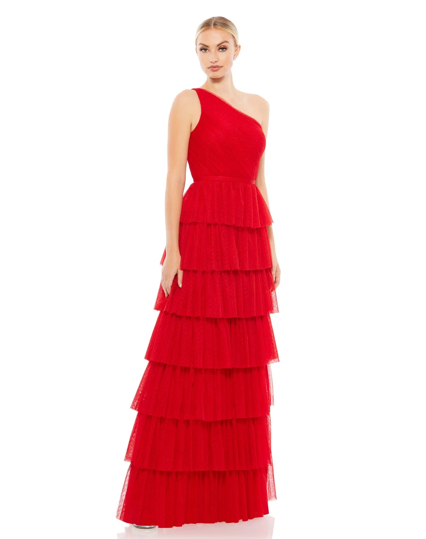 Ieena For Mac Duggal One Shoulder Layered Tiered Tulle Gown
