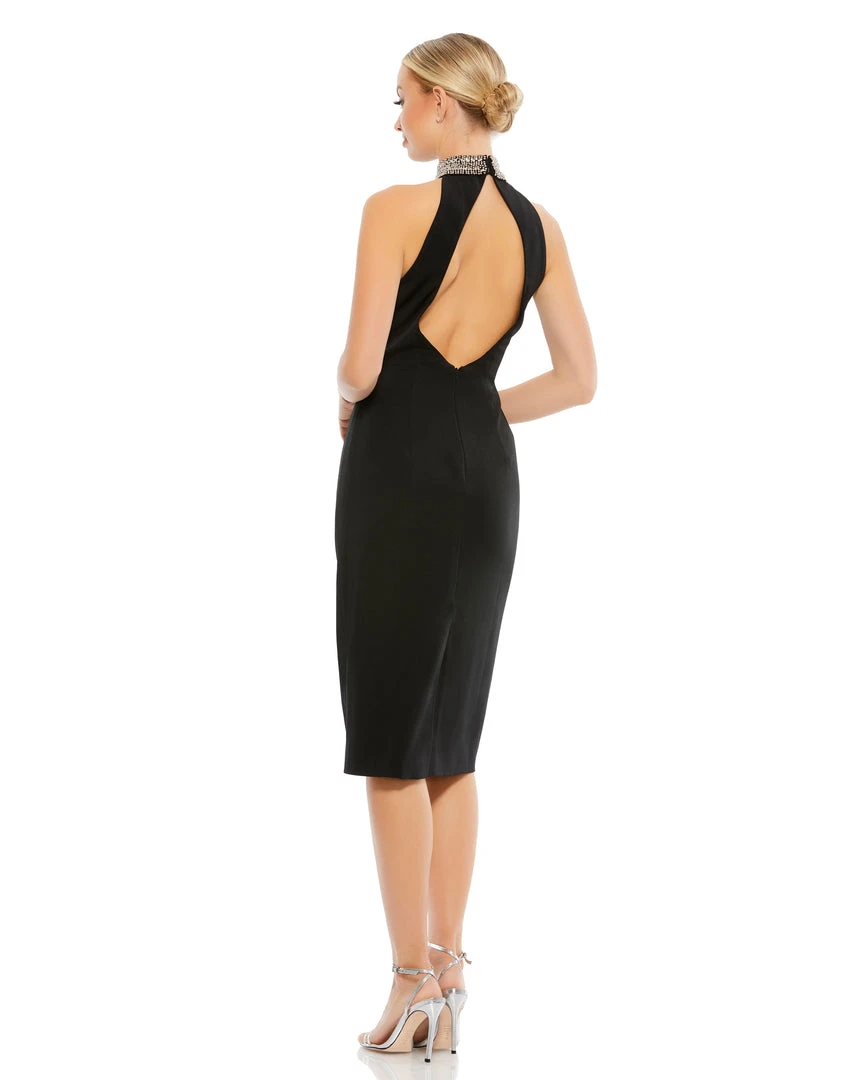 Ieena For Mac Duggal Open Back Jeweled Halter Midi Dress