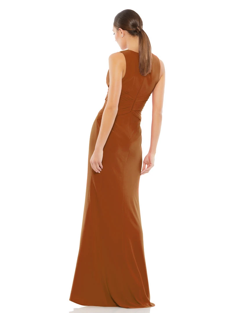 The focus is on you in this ultra-flattering gown. The one that you’ll want for prom, a friend’s “I do’s” or an extra-special date night, this sleek gown is styled with a deep V-neckline, sleeveless shoulders, a pleated, crisscrossed waist, and a sexy slit. It’s minimalist elegance at its finest.