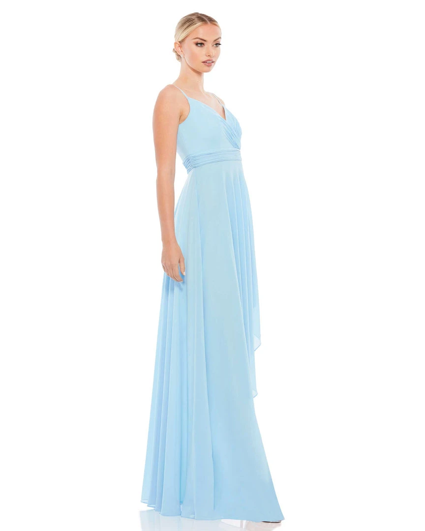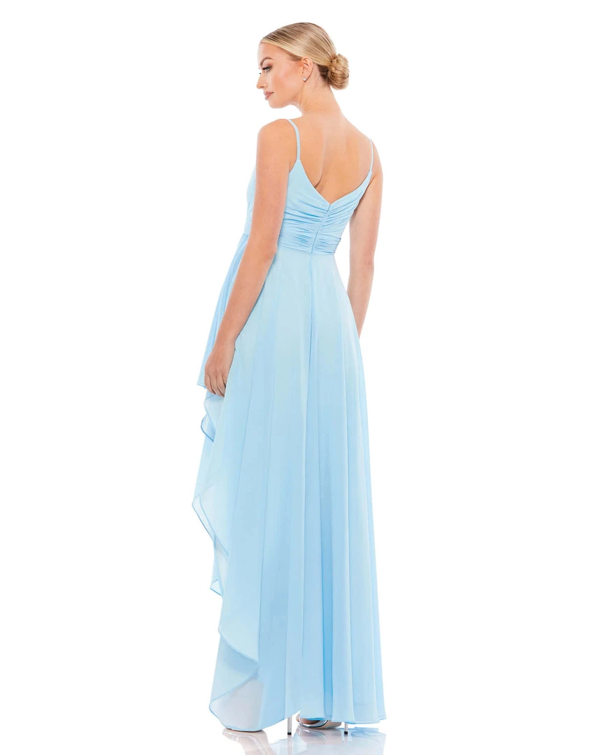 Sleeveless chiffon maxi dress with ruched faux-wrap v-neckline, spaghetti straps, and a flowy asymmetrical hi-low ruffle hem.