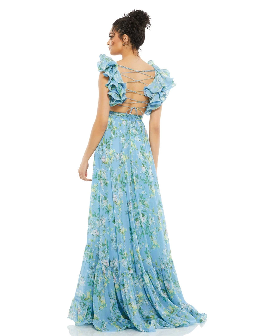 Gorgeous chiffon maxi dress with cut-out sides and back, pleated bodice, and a sexy lace-up open back. Dramatic ruffles accent the shoulders, and a flowy tiered skirt completes the look.