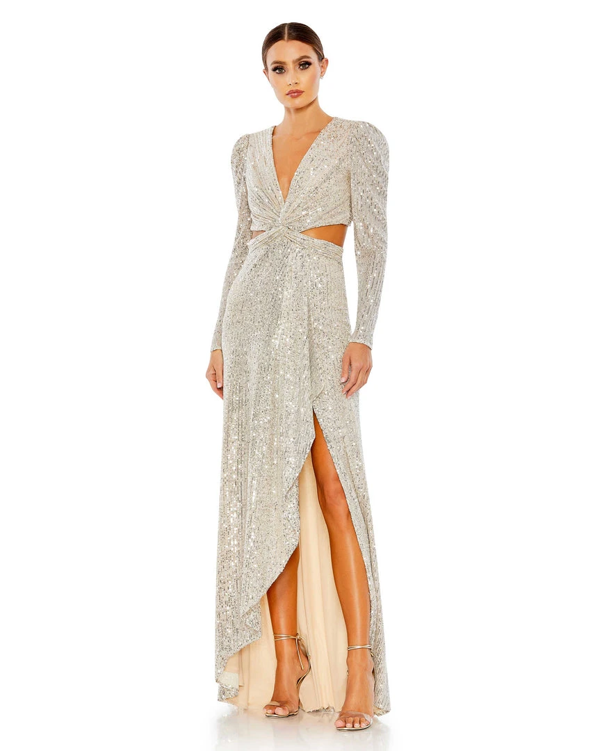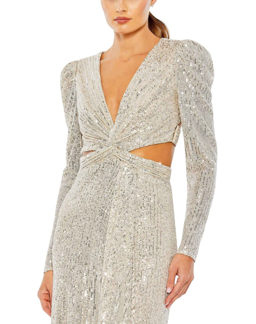Ieena For Mac Duggal Sequined Criss Cross Long Sleeve Gown
