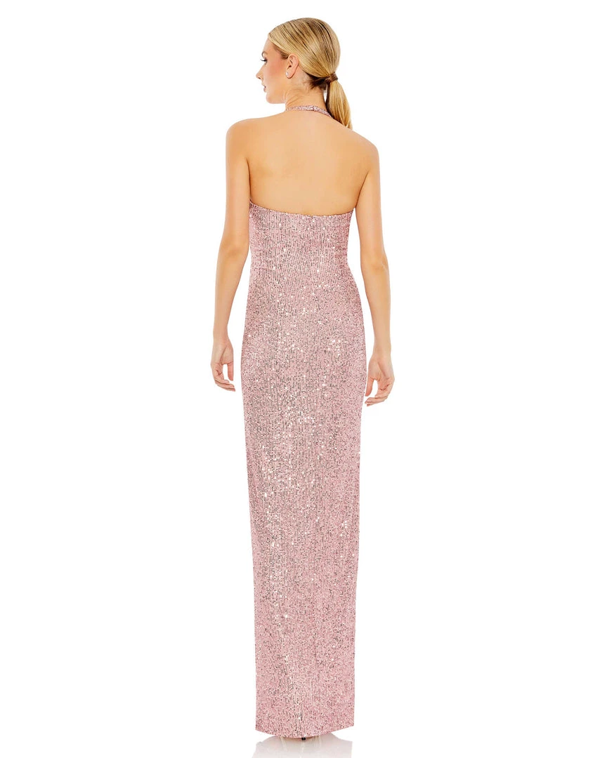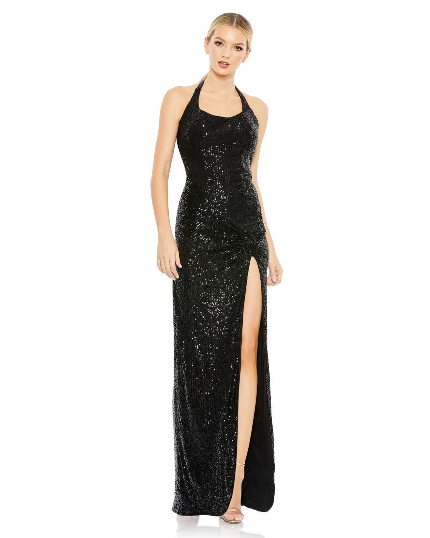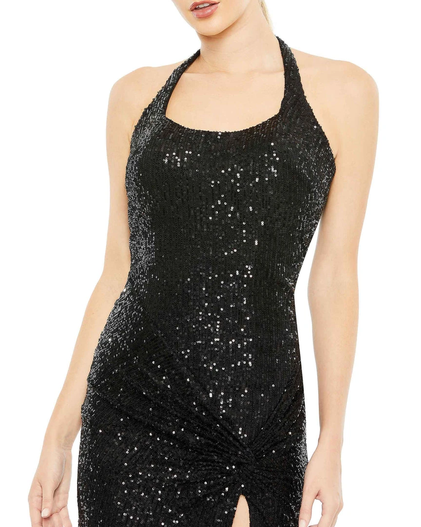 Ieena For Mac Duggal Sequined Halter Strap Low Side Knot Gown Shop For