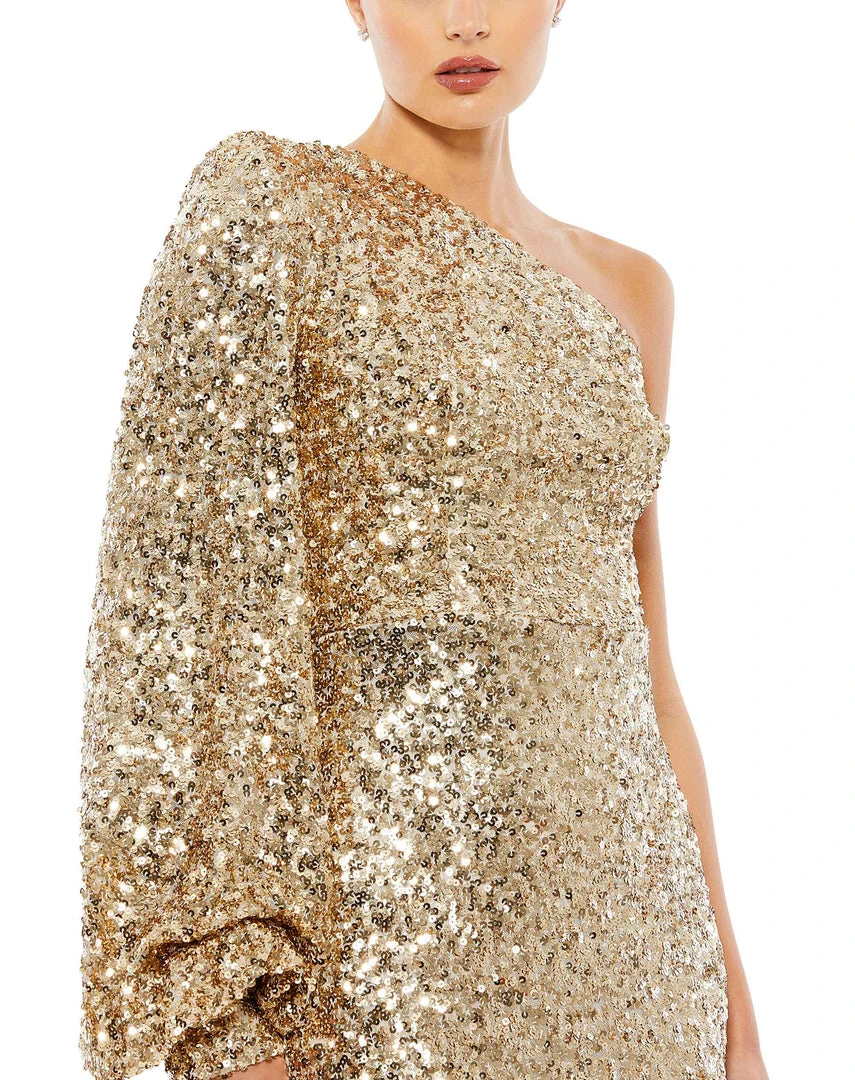 Ieena For Mac Duggal Sequined One Shoulder Bishop Sleeve Trumpet Gown