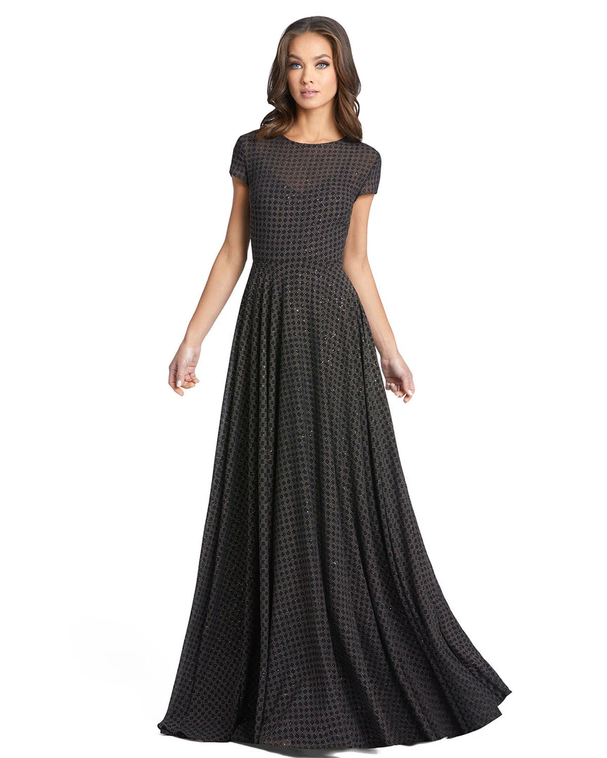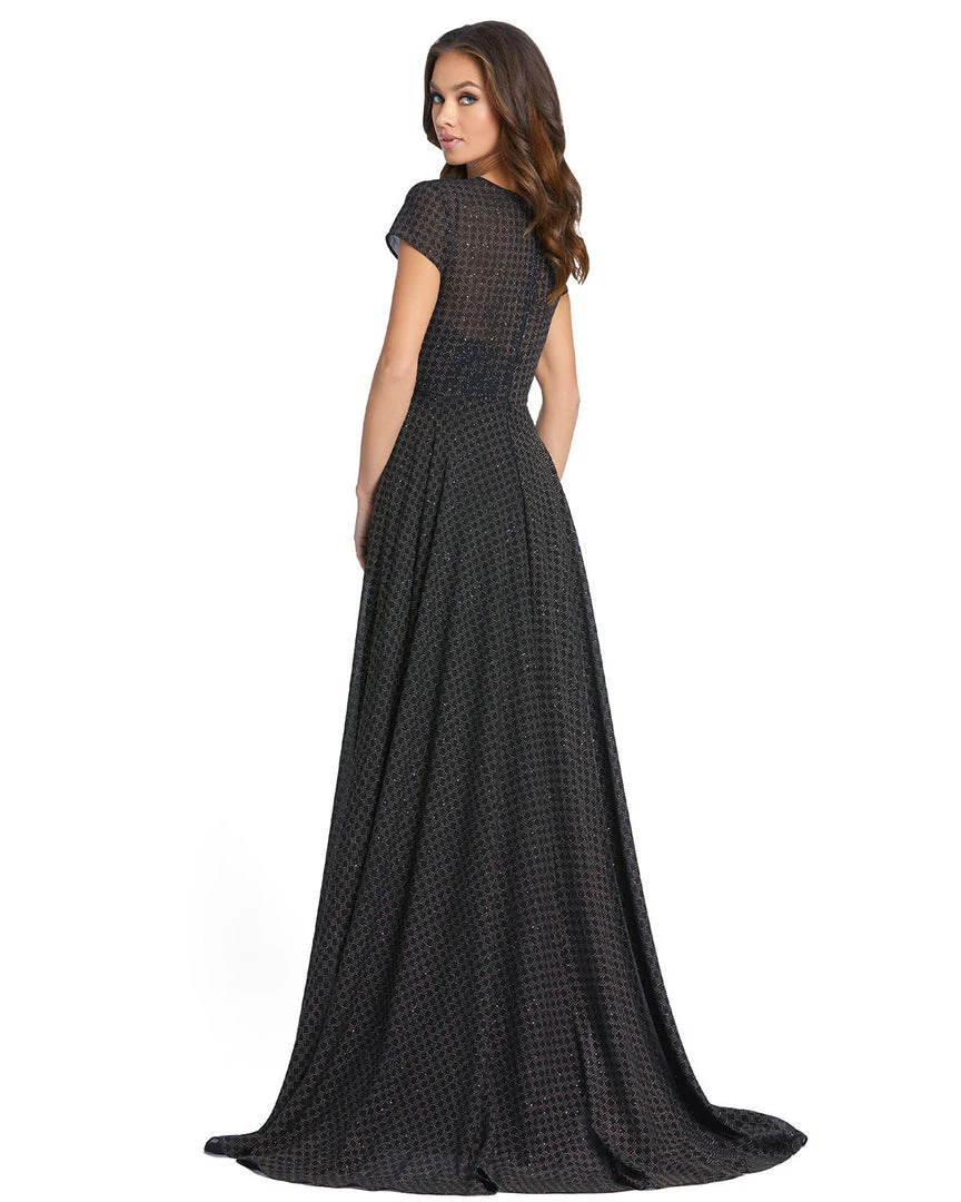 Black & gold A-line evening gown with short sleeves, a semi-sheer bodice, and sweeping train. The floor-length skirt features a waist-high side slit.