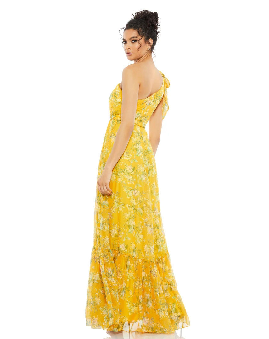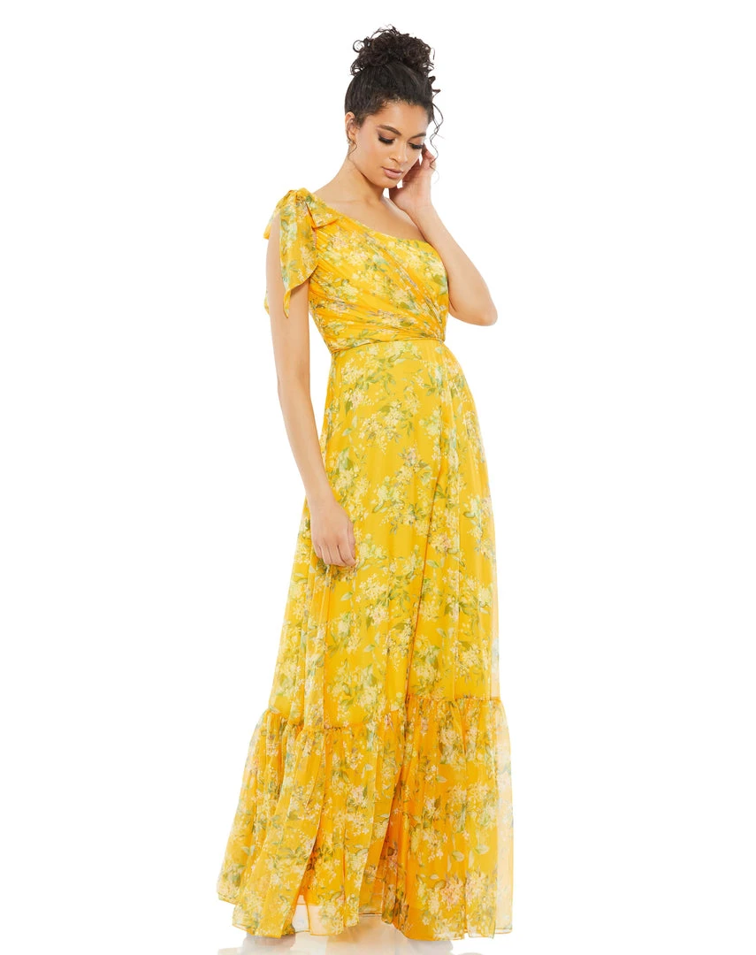 Vibrant floral maxi dress with one-shoulder bow detailing and a flowy tiered skirt.