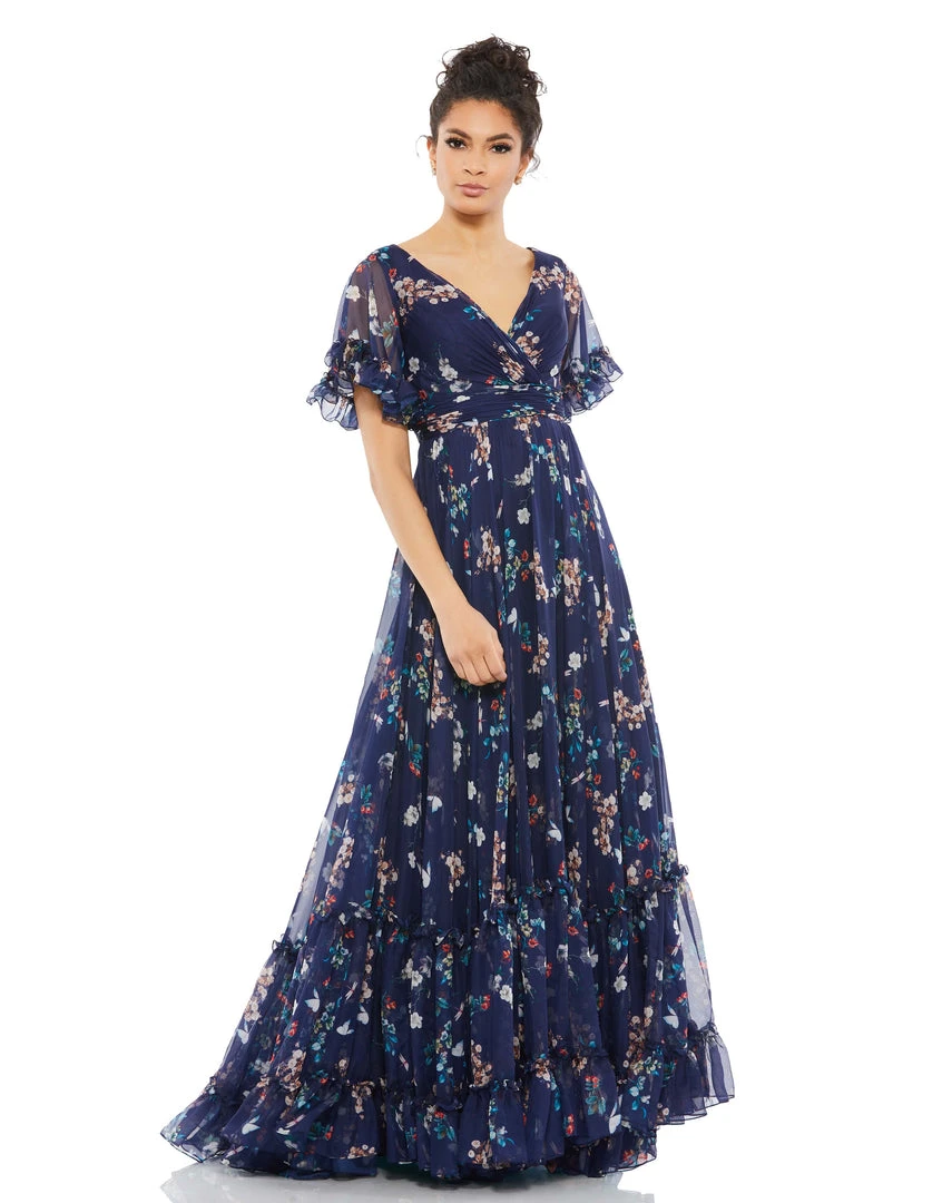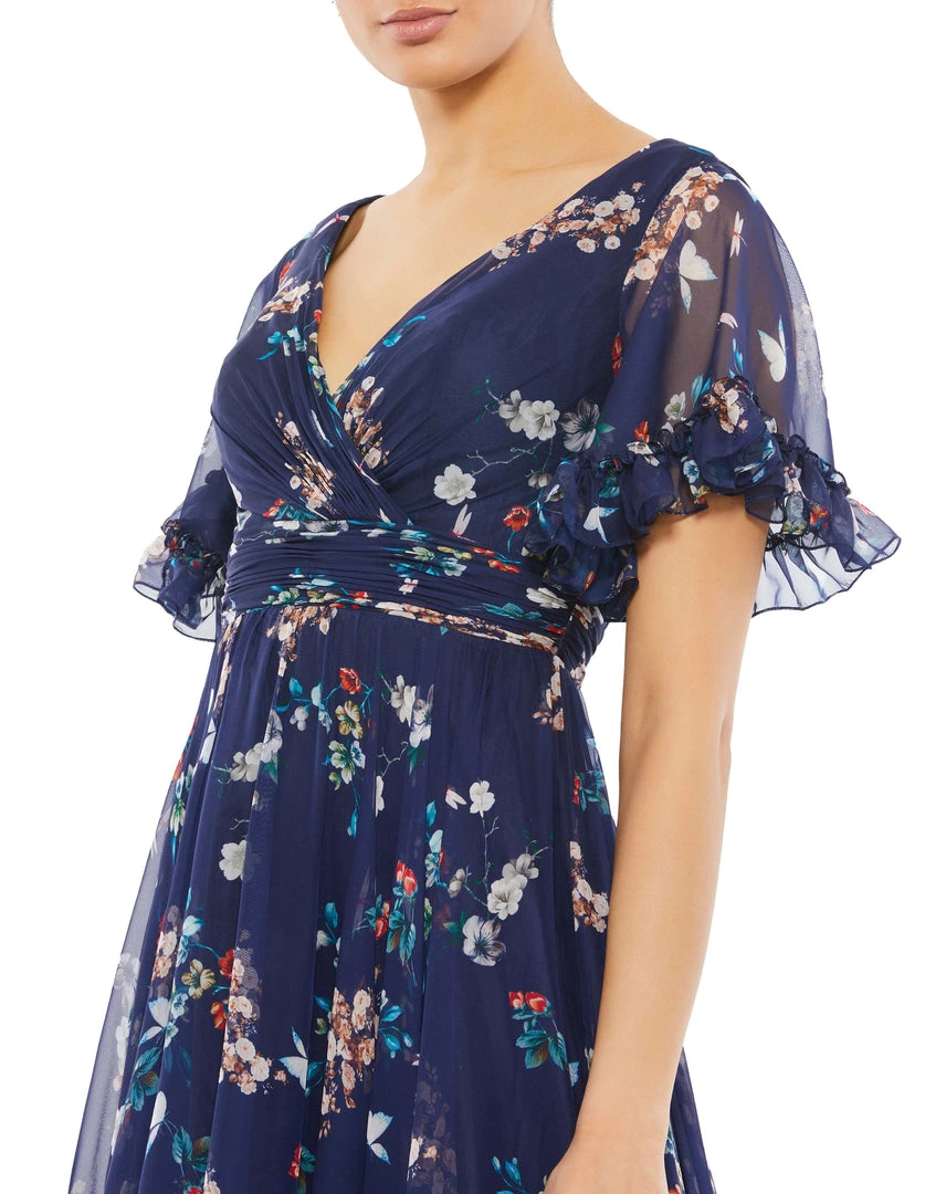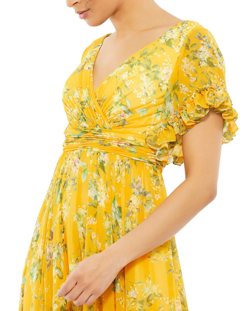 Whimsical floral maxi dress with a ruched bodice and faux-wrap v-neckline, sheer flutter sleeves, pleated waistband, and a tiered flowy skirt.Â