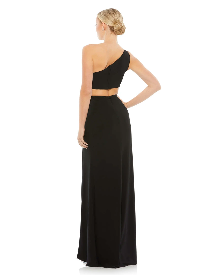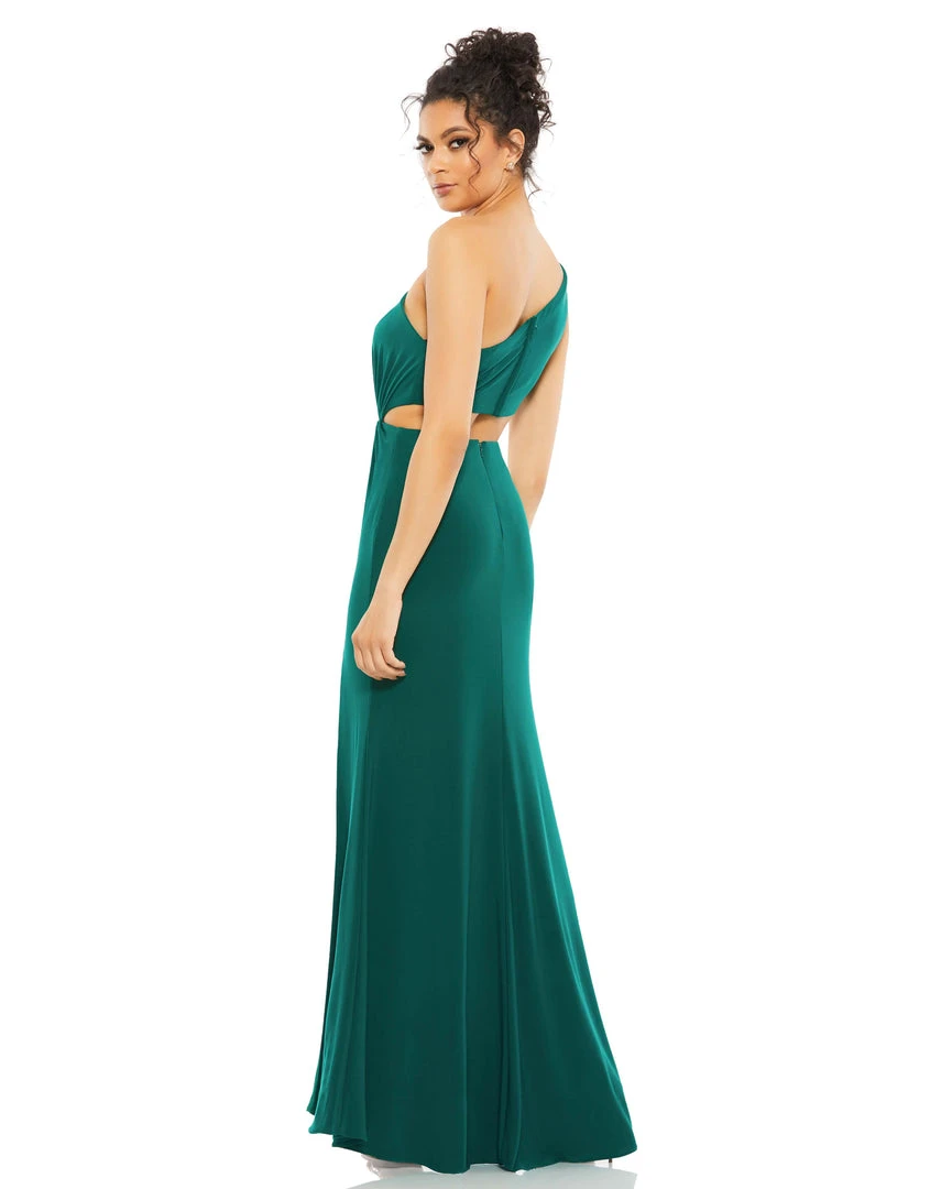 One-shoulder gown with a sexy wrap-around midriff cutout, ruching at the waist, and a floor-length skirt with a thigh high slit.
