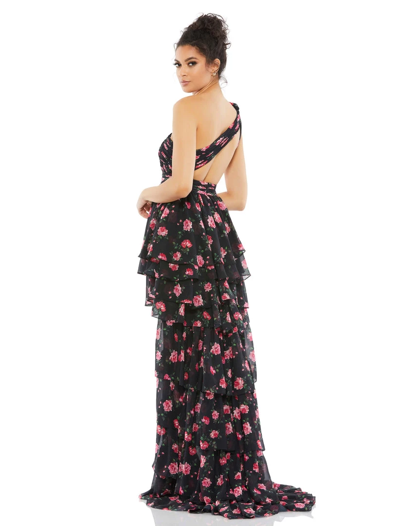 Bring the drama with this sexy one-shoulder dress. You’re dressed to thrill in our rose-print chiffon gown with so much to admire — from a single ruched strap to a pleated bodice with a cutout back to the tiered mini skirt that transforms to full-length with a sweep train finish.Â