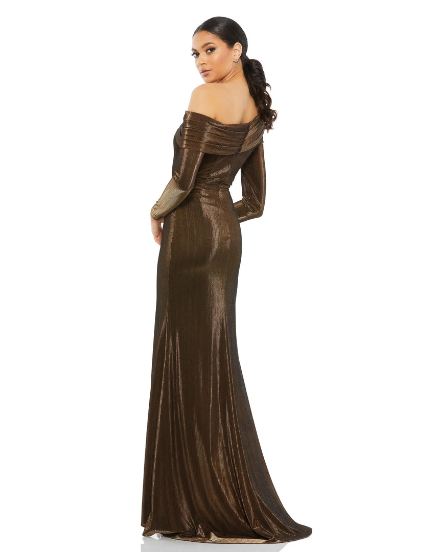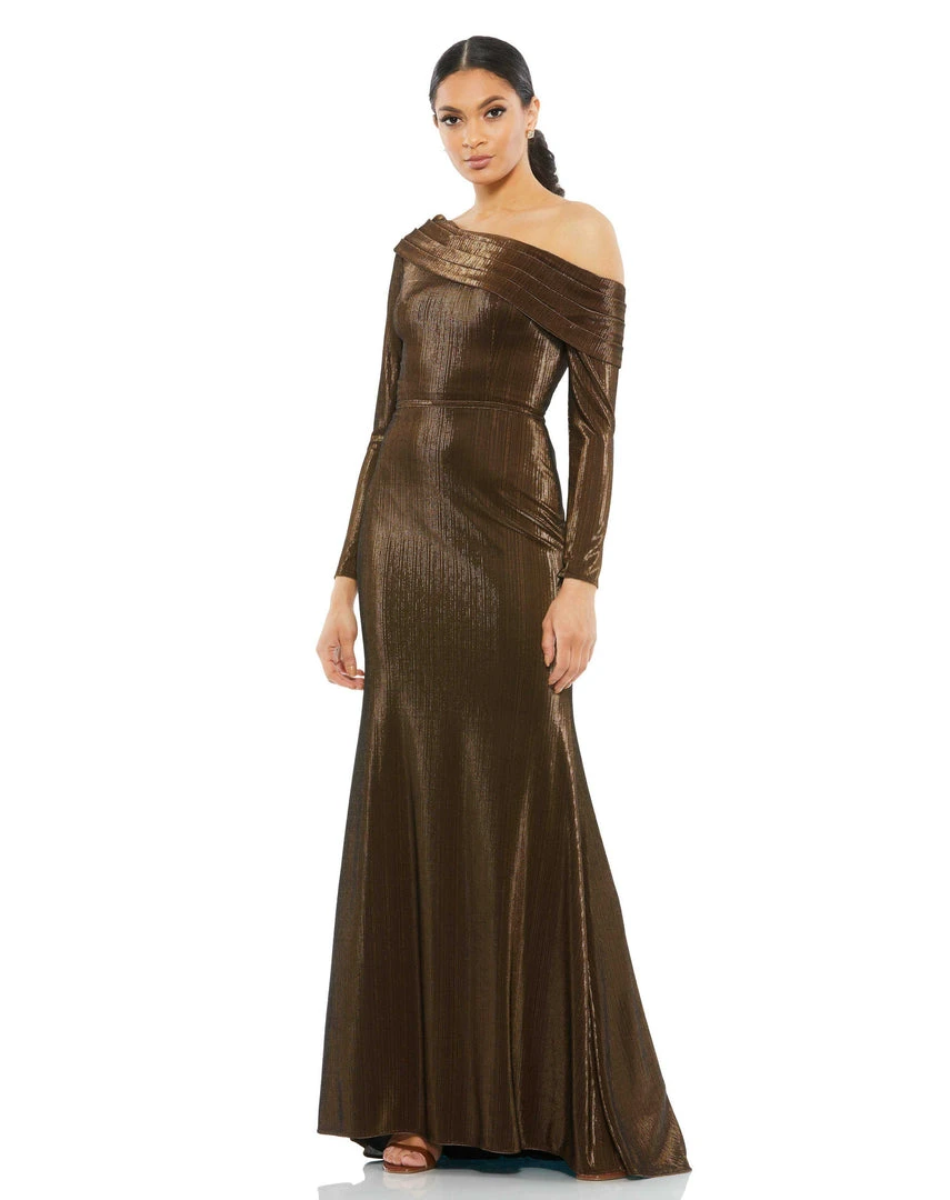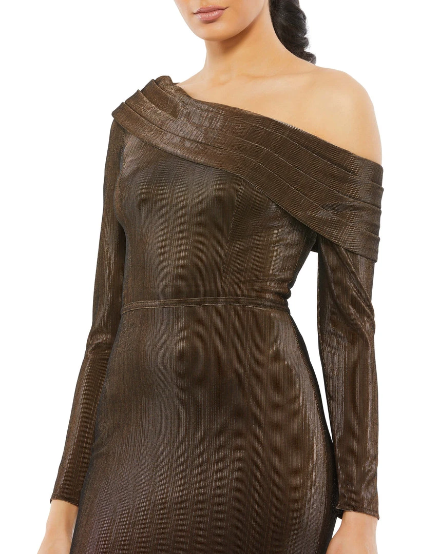 All eyes are on you in this exquisite gown fashioned from finely-ribbed fabric with a luxe metallic finish. The dress opens with a pleated foldover collar that drapes off the shoulder. Long sleeves and a formal trumpet finish make it perfect for winter’s black-tie events.