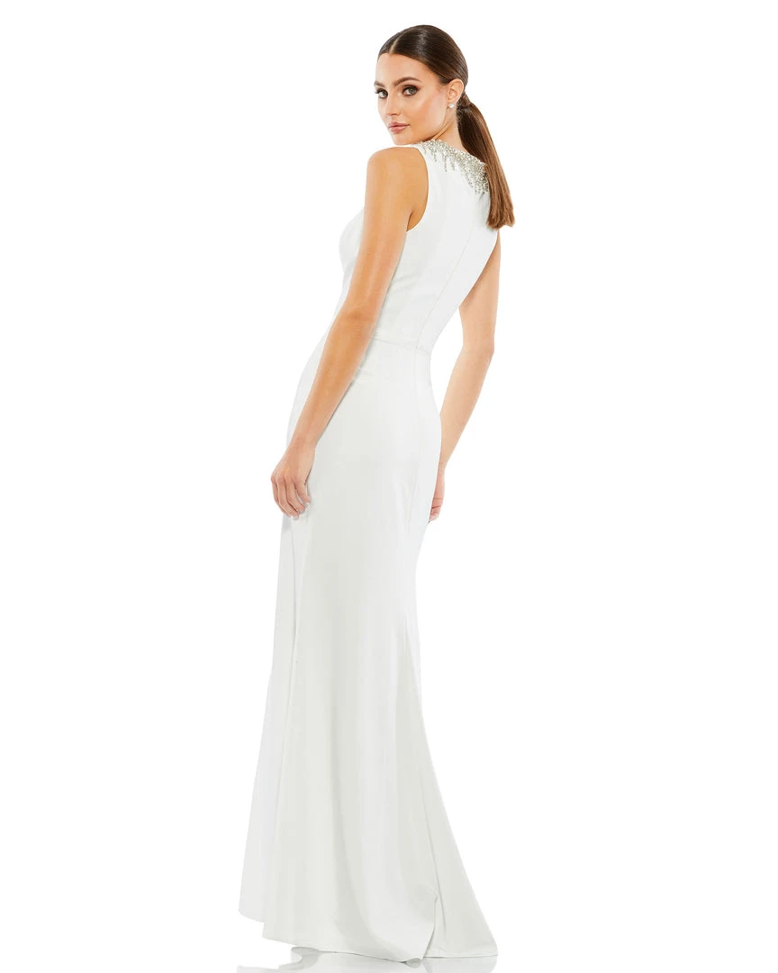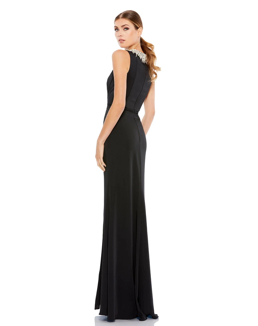 Form-fitting column gown with a beautiful rhinestone-embellished collar, seaming detail at the natural waist, and a leg-baring front slit.