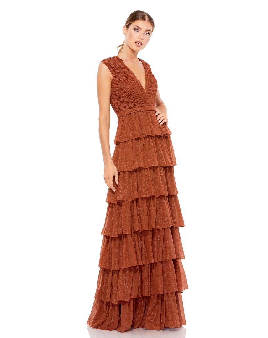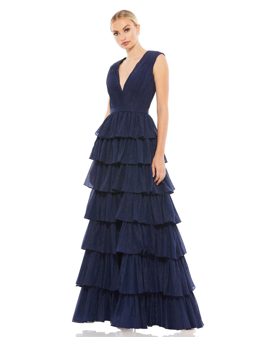Sparkly ruffle layered maxi with a ruched bodice and plunging neckline.