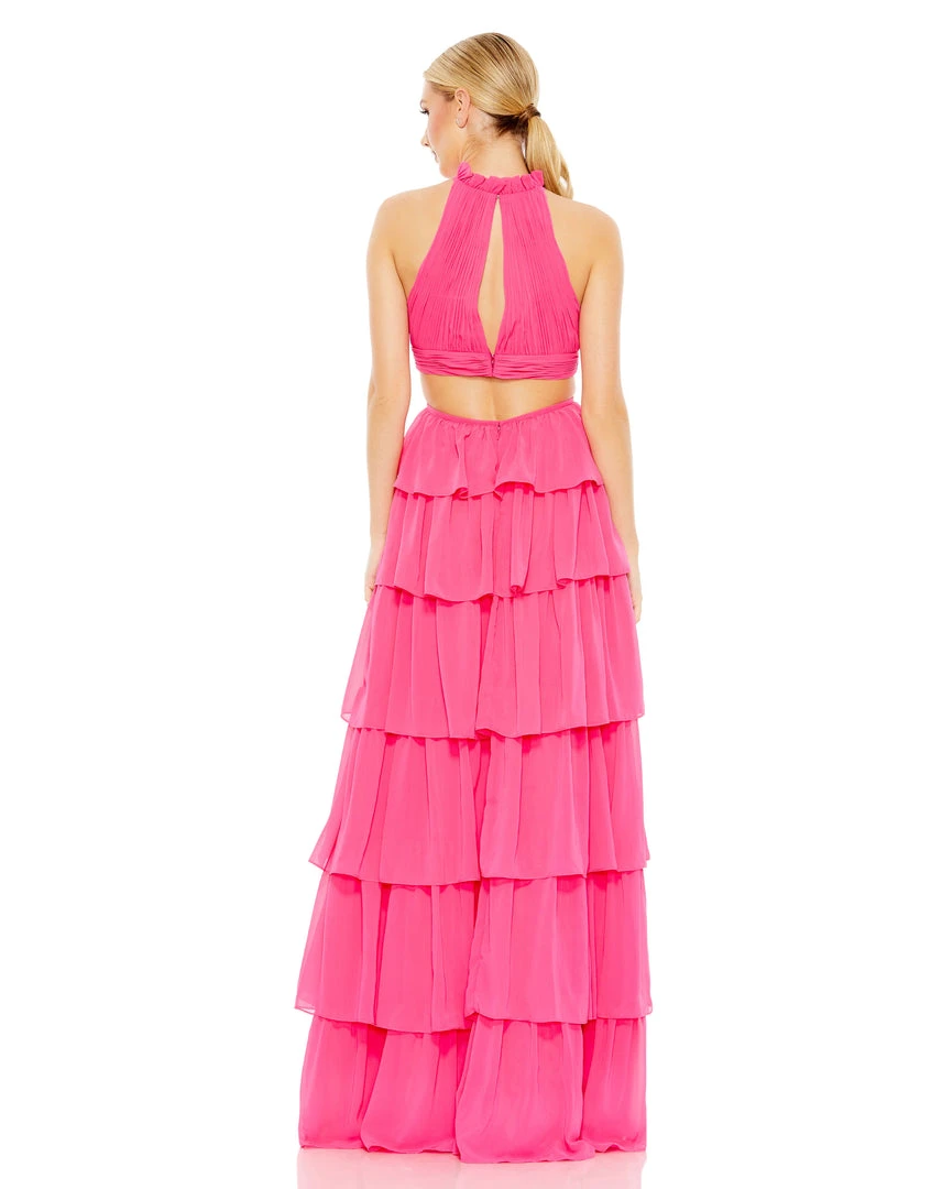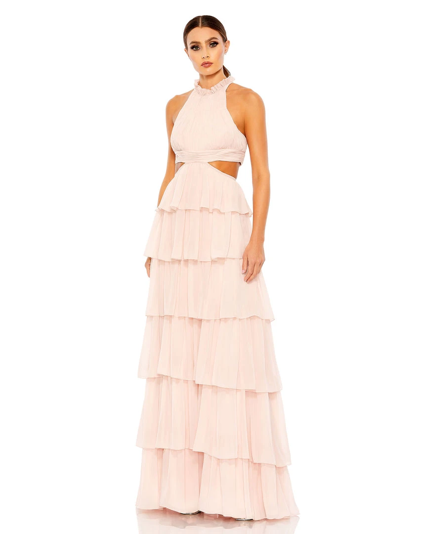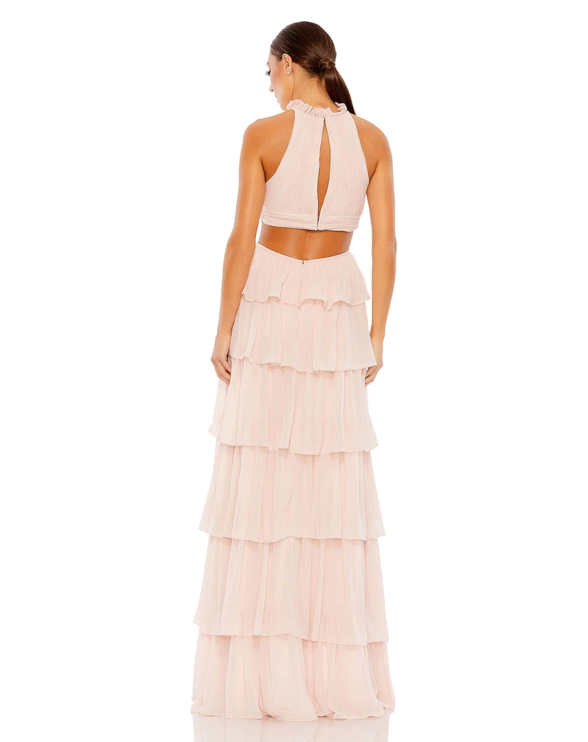 Ieena For Mac Duggal Tiered Ruffle Pleated High Neck Ball Gown