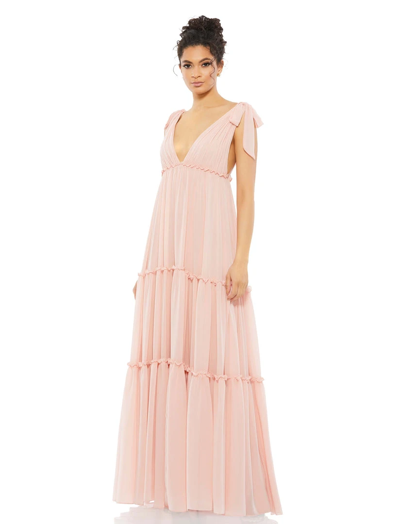 Flowing tiered maxi dress with a plunging v-neckline and tie accents at the shoulder.