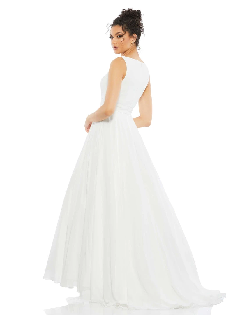Gorgeous white chiffon ball gown with a deep v-neckline, closed back, and an a-line skirt with layered tulle to provide structure.