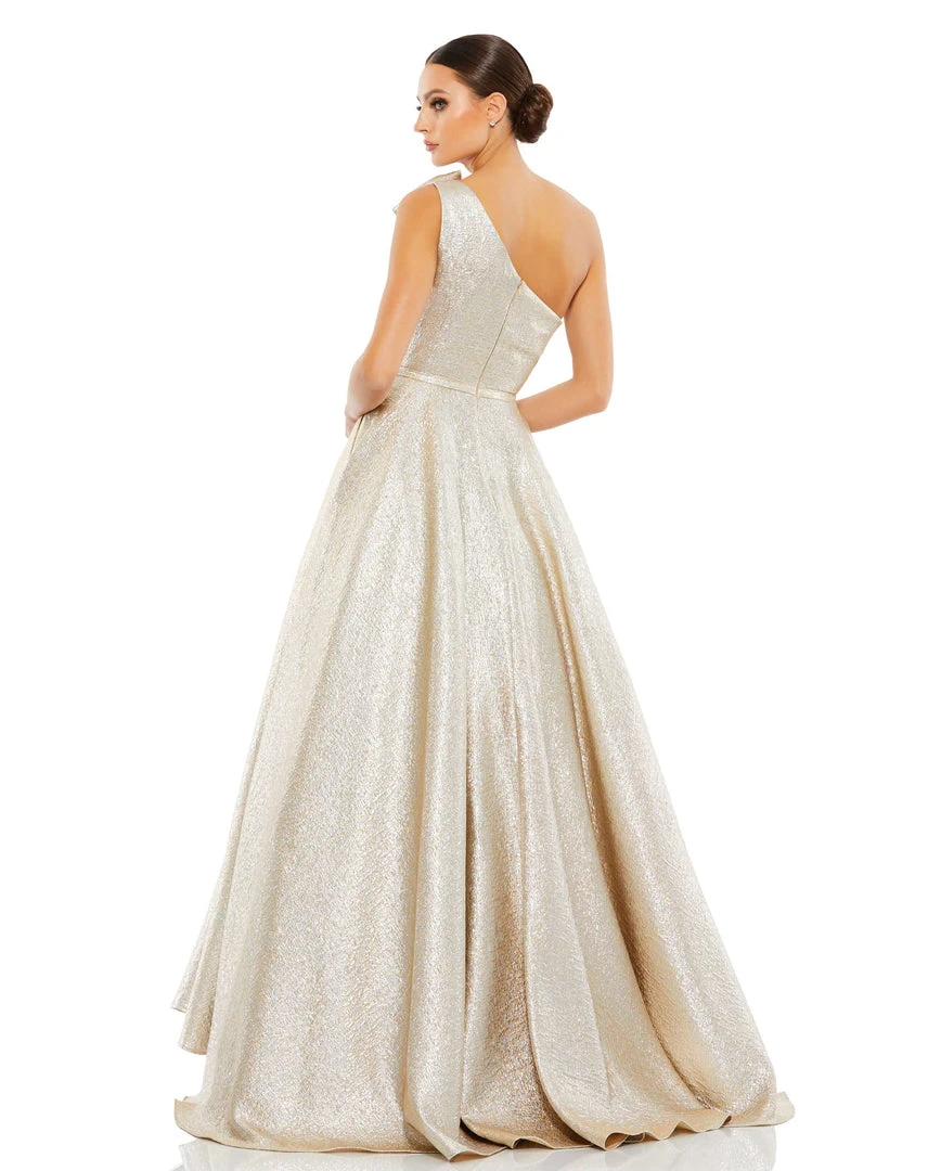 Mac Duggal Bow One Shoulder Metallic Ballgown