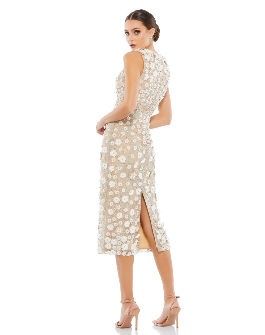 Sleeveless midi dress with a floral-embroidered mesh overlay, 3D flowers, and a hand-beaded waist.