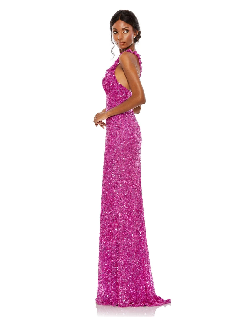 This pretty gown injects whimsy in the form of square and flower-cut sequins among its dazzling embellishments. The slimming dress is detailed with ruffled trim, gathering at the chest, and a sweet-meets-sexy V-shaped back. A glamorous pool of fabric delivers a luxe sweep train finish.