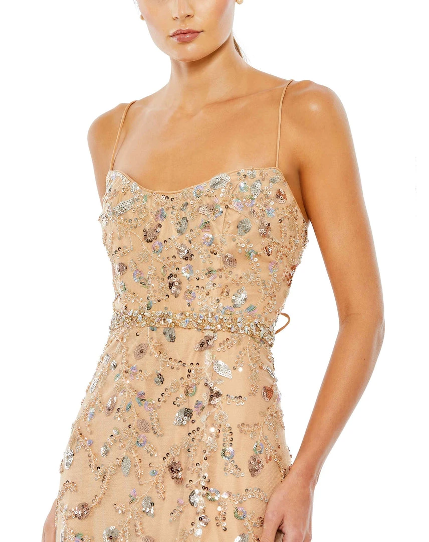 Perfect for a fresh-air affair or springtime prom, this chic gown twinkles with botanical sequin detail. Cut in a sassy, modern silhouette, the full-length dress has barely-there straps, a curved neckline, and an off-center slit that shows some leg—and your awesome shoes. An adjustable corset back adds a flirty and fashionable finishing touch.