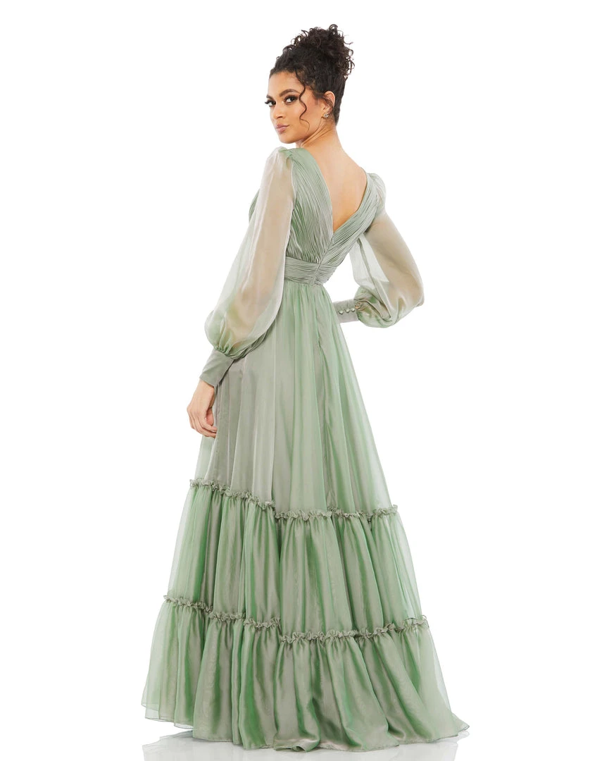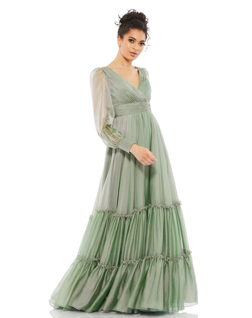 Romantic maxi dress with a pleated bodice and faux-wrap v-neckline, tiered floor-length skirt, and sheer long sleeves.