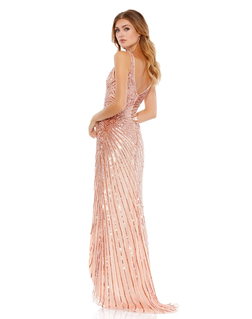 Sexy evening gown with diagonal alternating rows of sequins and beads, a plunging faux-wrap v-neckline, and thigh-high slit.