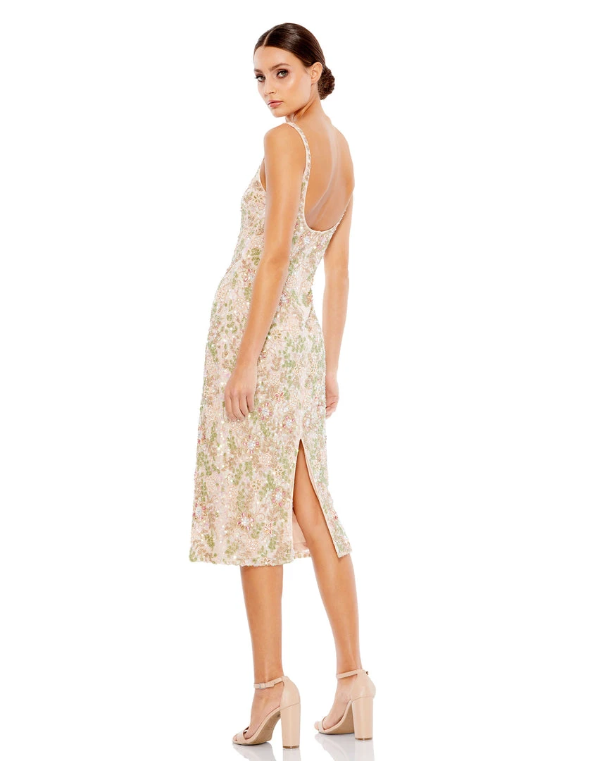 Elegant fully beaded floral midi cocktail dress with a scoop back and back slit.