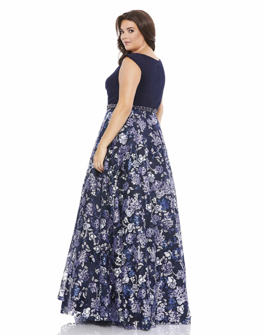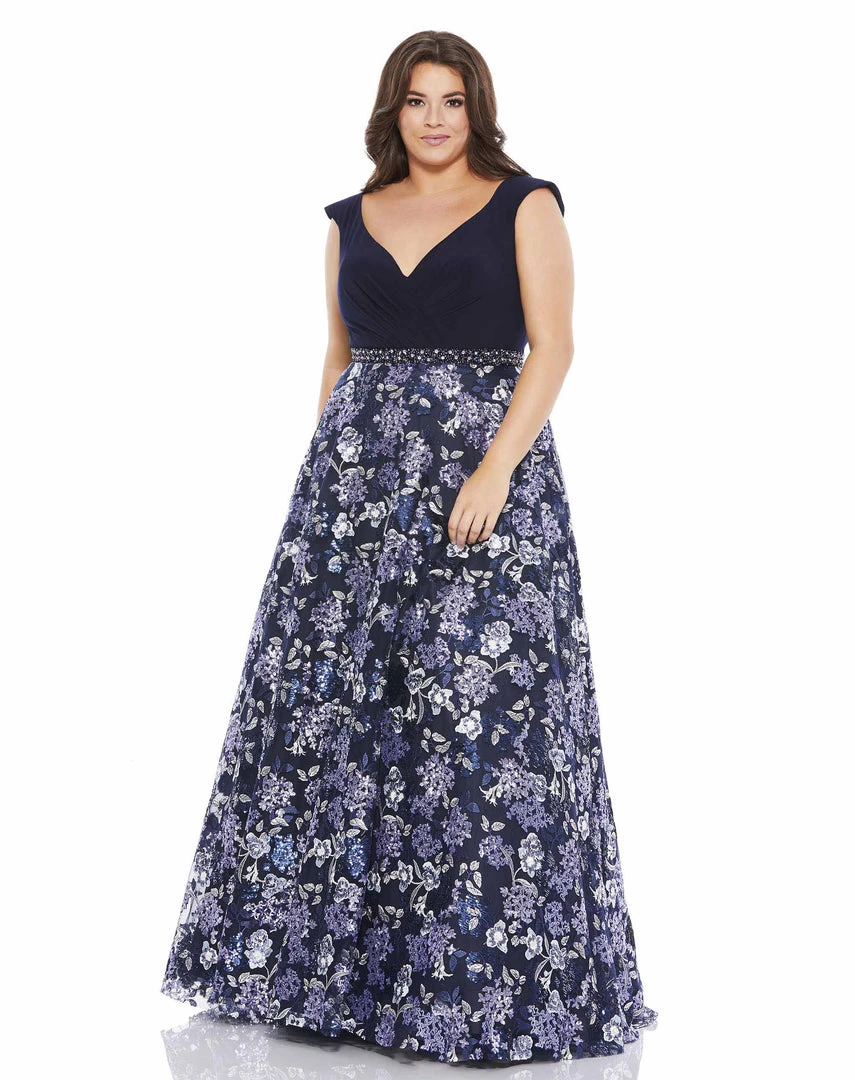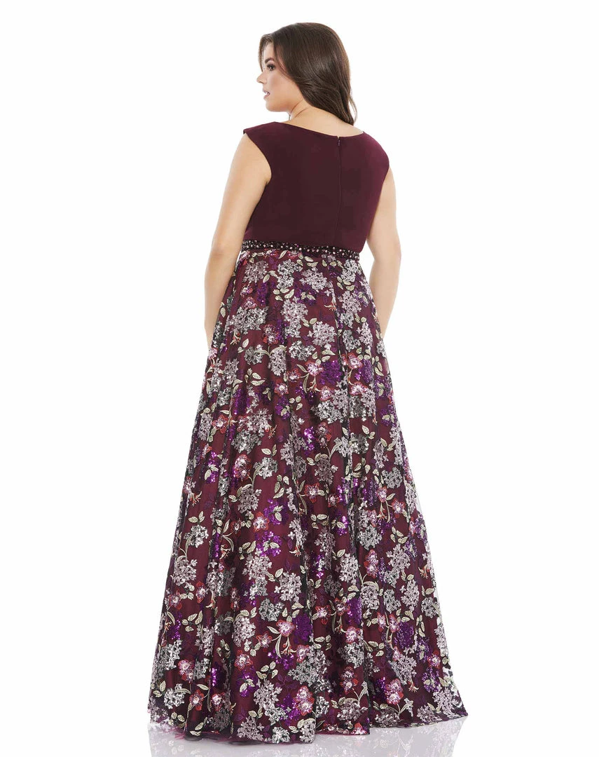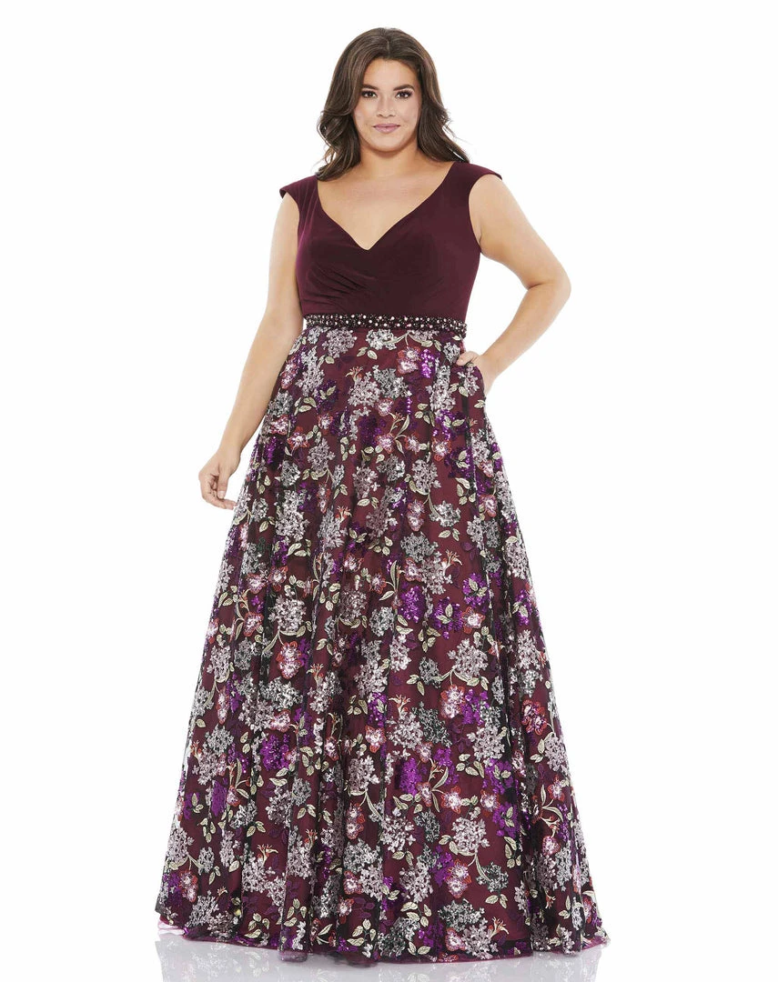 Stunning ball gown with sequined flowers, a handmade rhinestone belt, and cap sleeves.