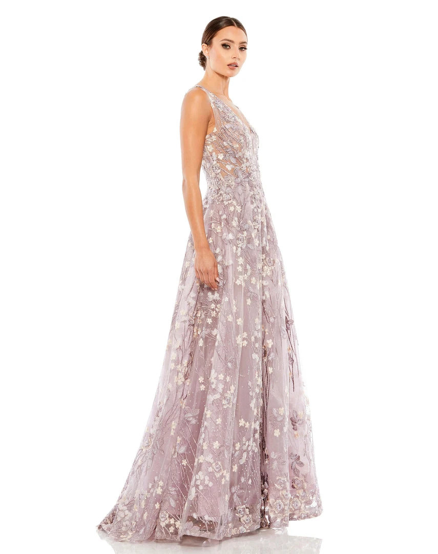 Gorgeous floral-embroidered gown with heat-set crystal accents throughout. The dress has a sheer mesh bodice with a v-cut neckline and back. The plunging illusion neckline features a sheer mesh inset mid-bust, and the floor-length skirt is finished with a sweeping train.