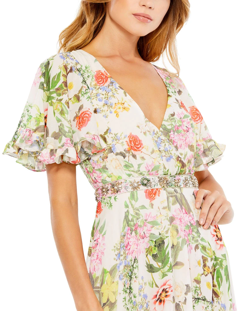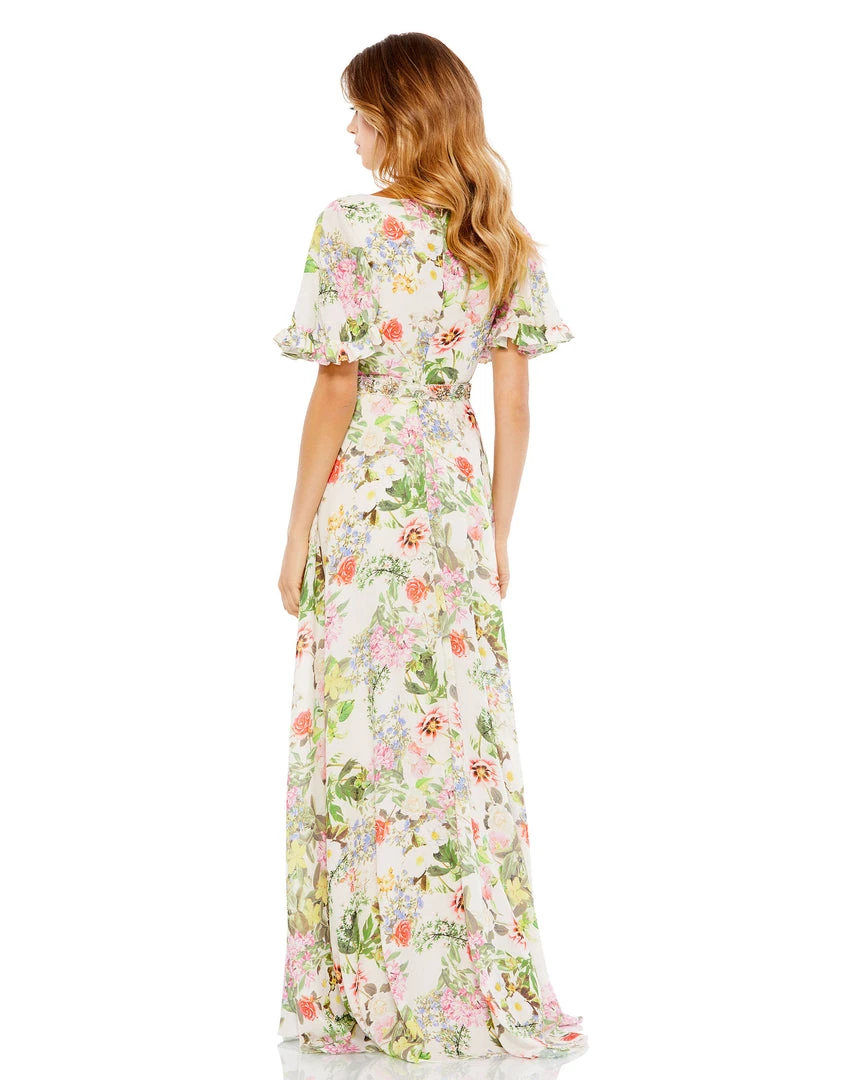Mac Duggal Floral V-Neck Pleated Maxi Dress