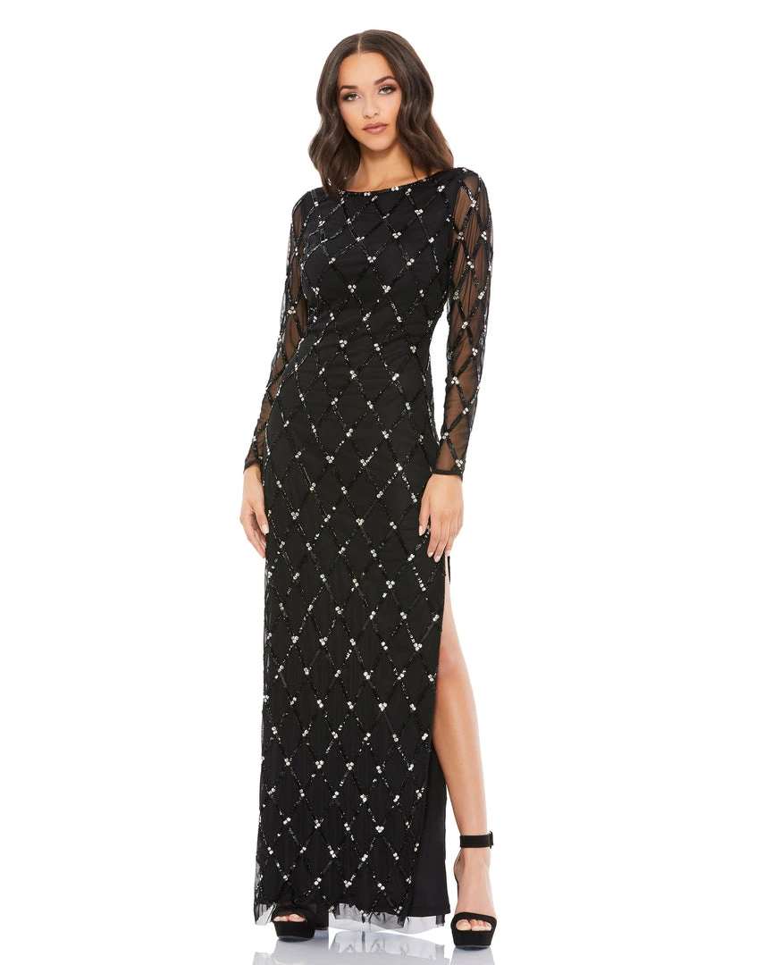 Lattice sequined sheath gown with sheer long sleeves and sequined neckline. Features a sexy open back and high side slit.