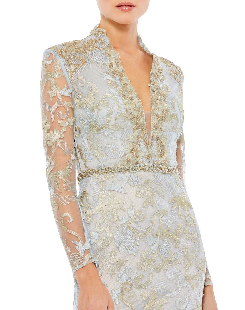 Long sleeve v-neck gown with decorative metallic-gold applique and embroidered detail throughout. Natural waist is accent by a hand-beaded belt.