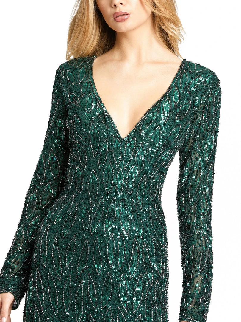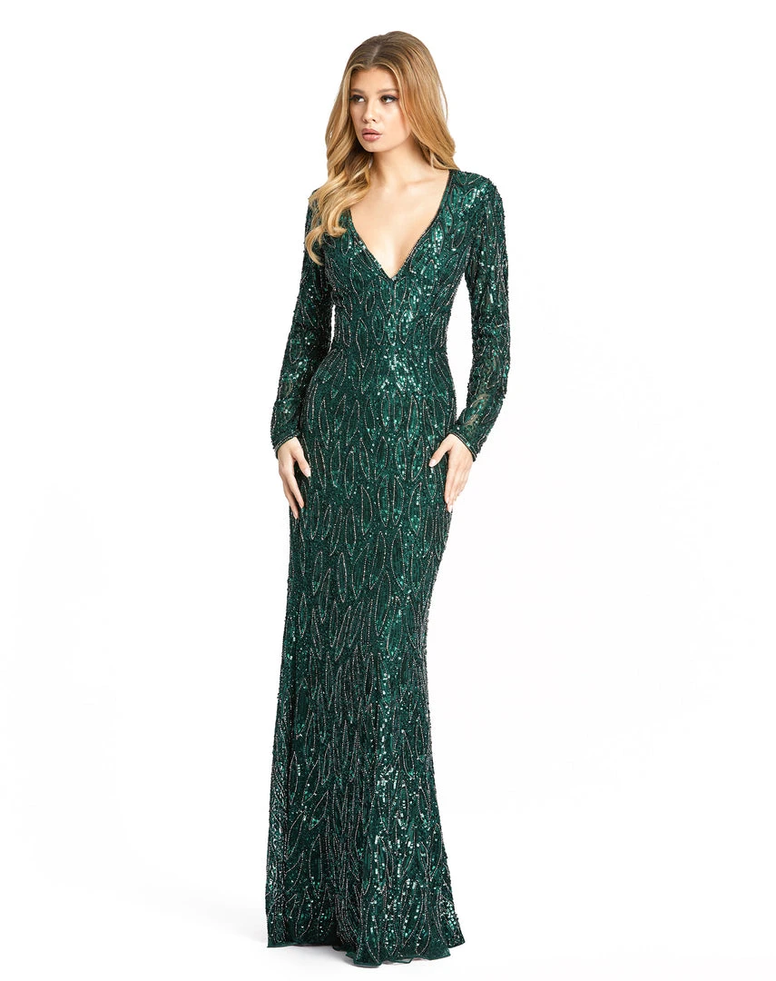 Long sleeve, fully embellished gown with a fitted bodice, plunging v-neckline, full-length skirt with a sweeping train, and gorgeous sequin and bead detailing throughout.