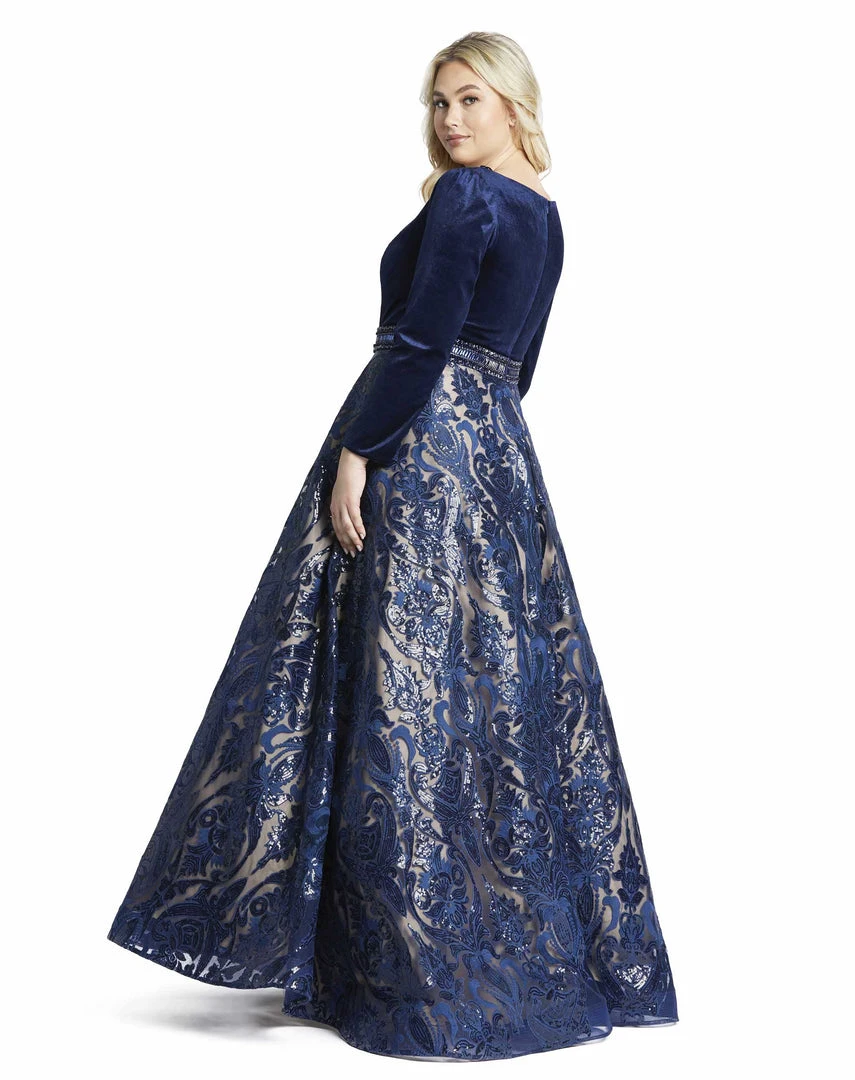 Elegant A-line evening gown with velvet bodice, hand-beaded belt, and sequined skirt.