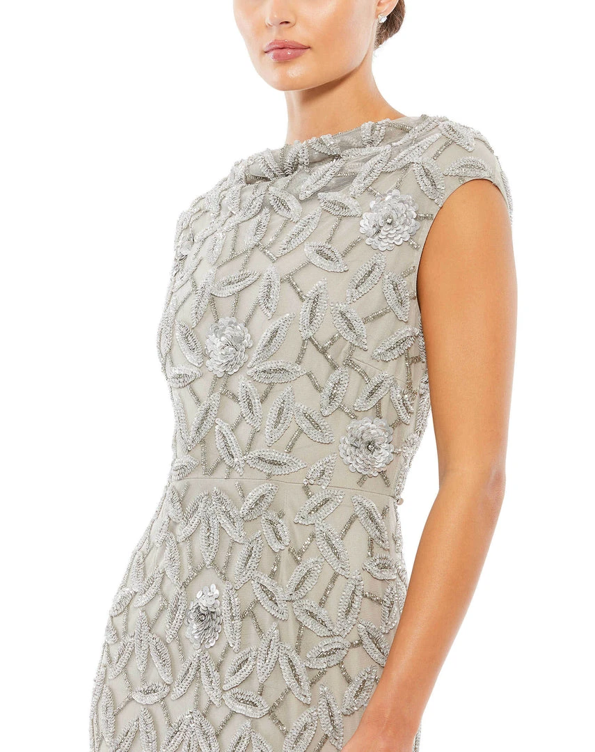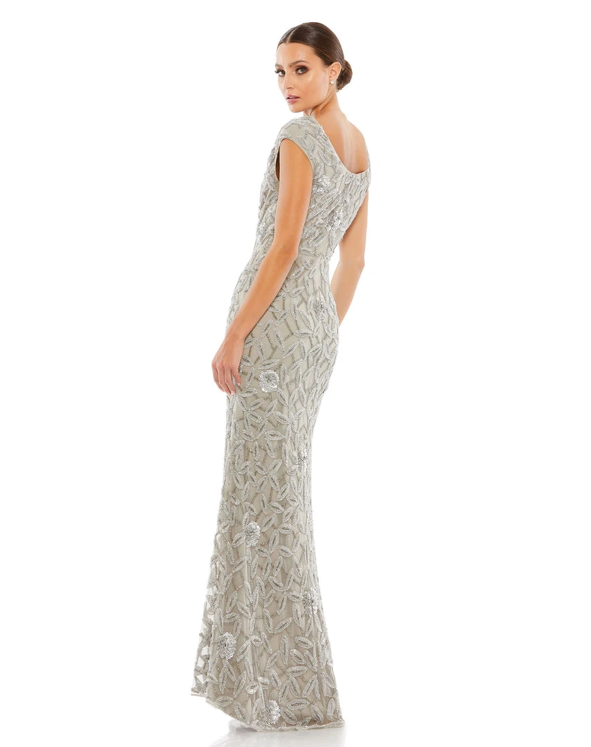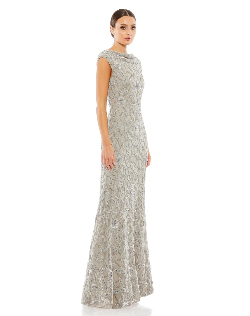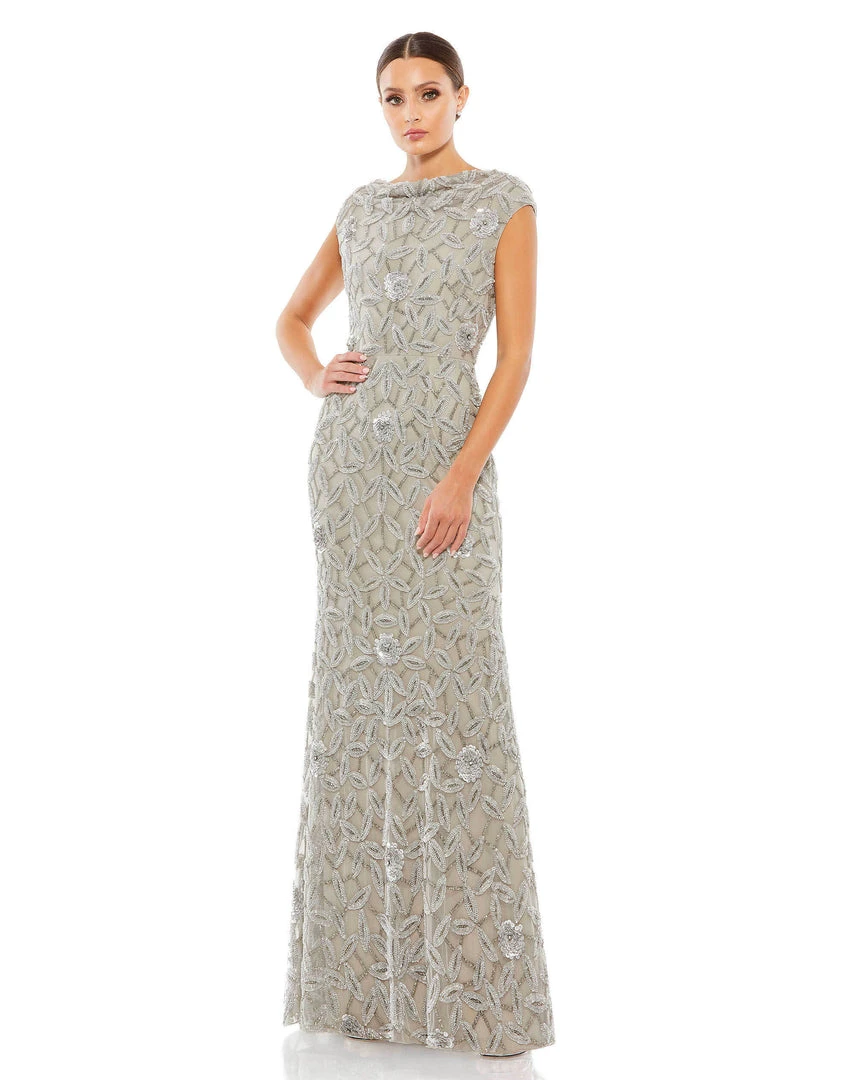 Mac Duggal Mother Of The Bride + Groom Dresses Floral Embellished Cowl Bateau Cap Sleeve Gown