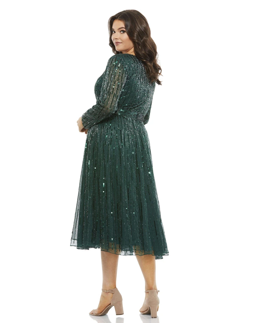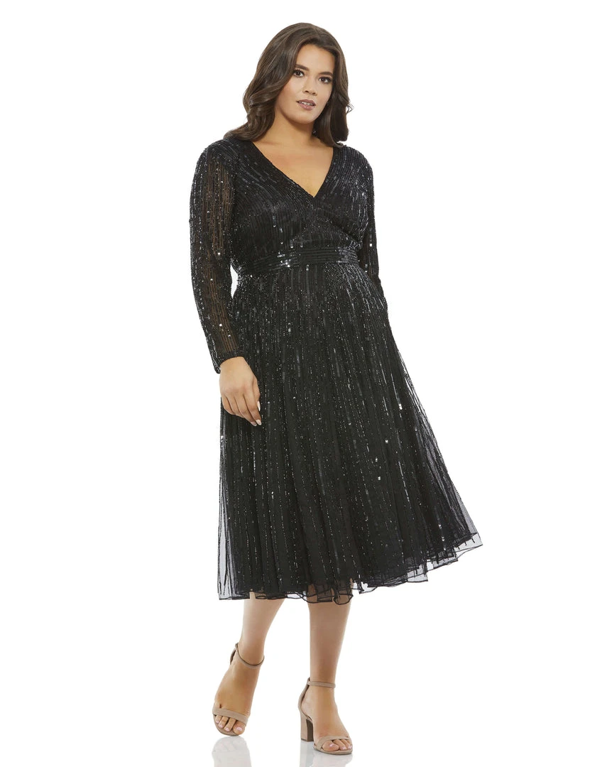 Mac Duggal Mother Of The Bride + Groom Dresses Sequined V-Neck Tea Length Cocktail Dress (Plus)