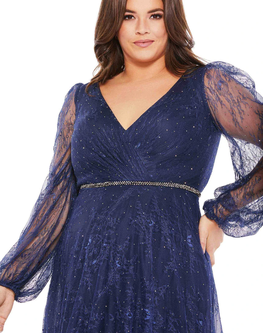 Whimsical midnight gown with a handmade rhinestone belt, lace overlay, and illusion blouson sleeves.