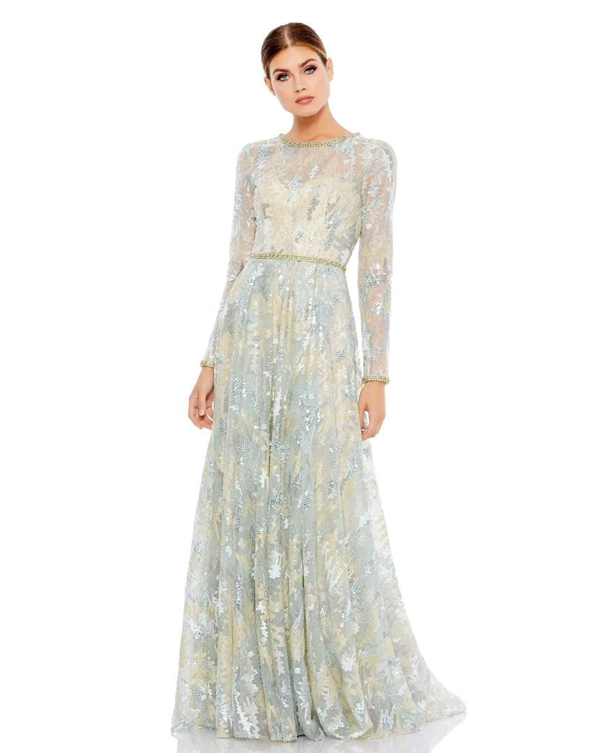 This stunning illusion long sleeve A-line gown. The illusion overlay is embroidered and embellished with sequins and hand-beaded floral accents. The gown is finished with a a rhinestone embellished belt, neckline, and cuffs.