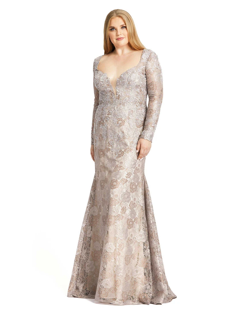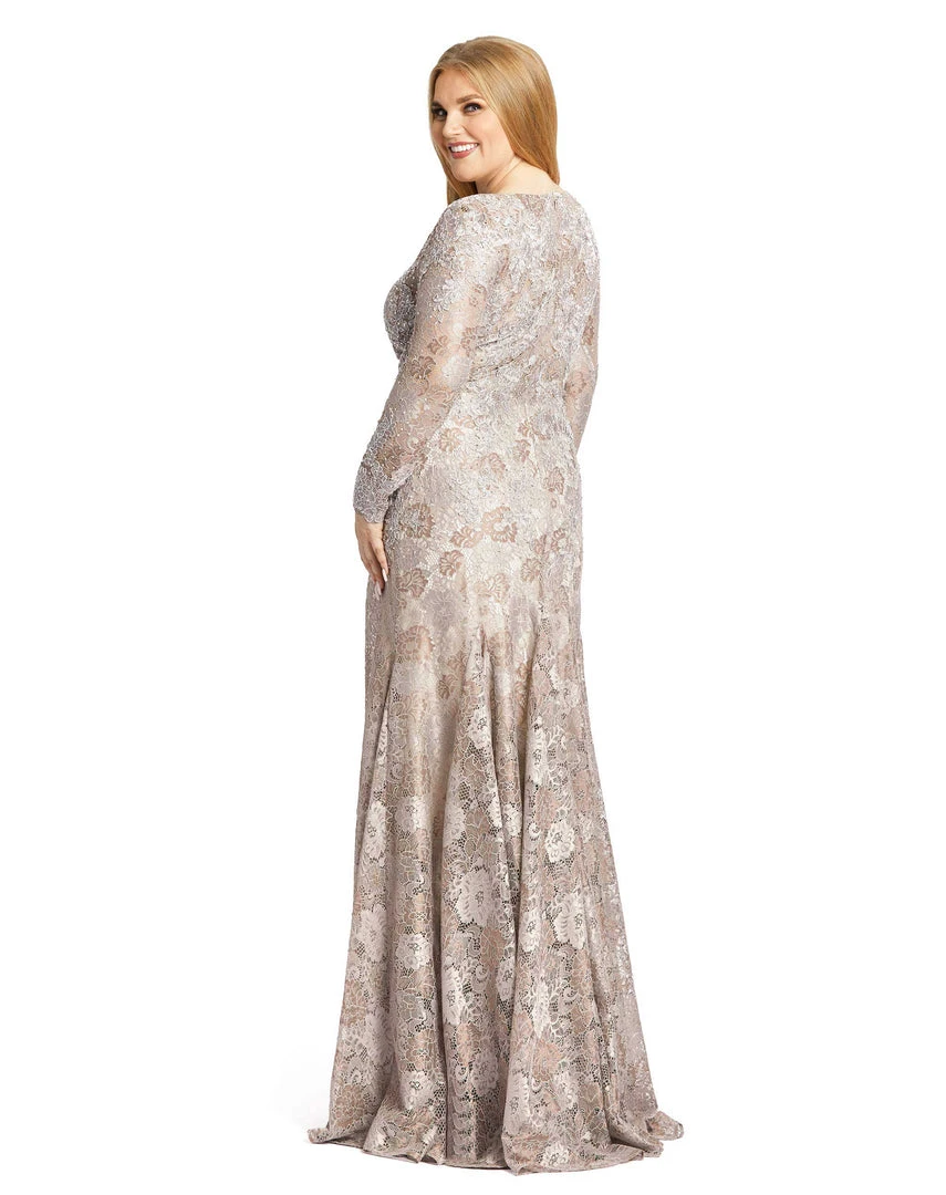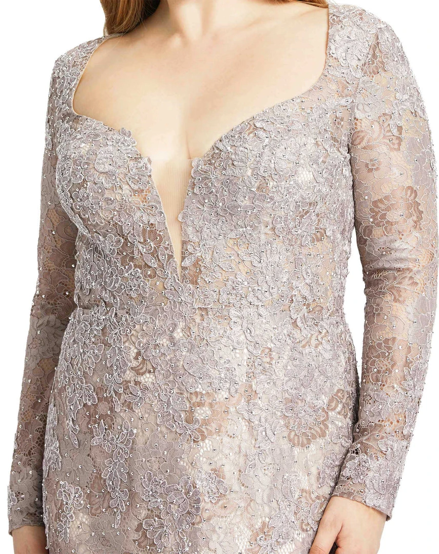 Embellished nude lace gown with long sleeves and a plunging illusion neckline.